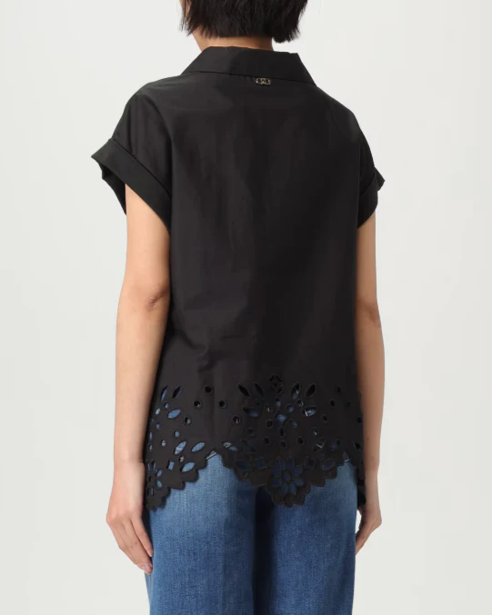 Polo Liu Jo, applicazione con ricami, collo classico con scollo a V, maniche corte, dettaglio in sangallo in cotone, colore nero