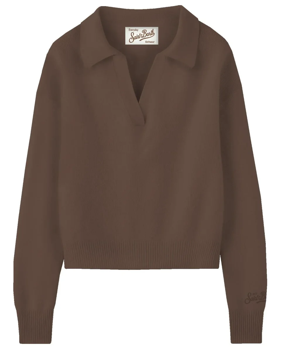 Polo in maglia Eze wool in lana, modello con collo a polo, maniche lunghe, colore marrone