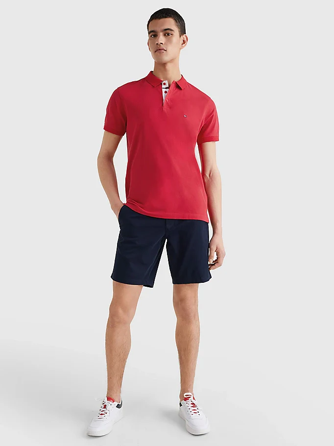 Polo Tommy Hilfiger, modello regular fit con chiusura a contrasto, colletto a polo, chiusura a tre bottoni, dettaglio iconico a contrasto sotto il colletto. Colore rosso