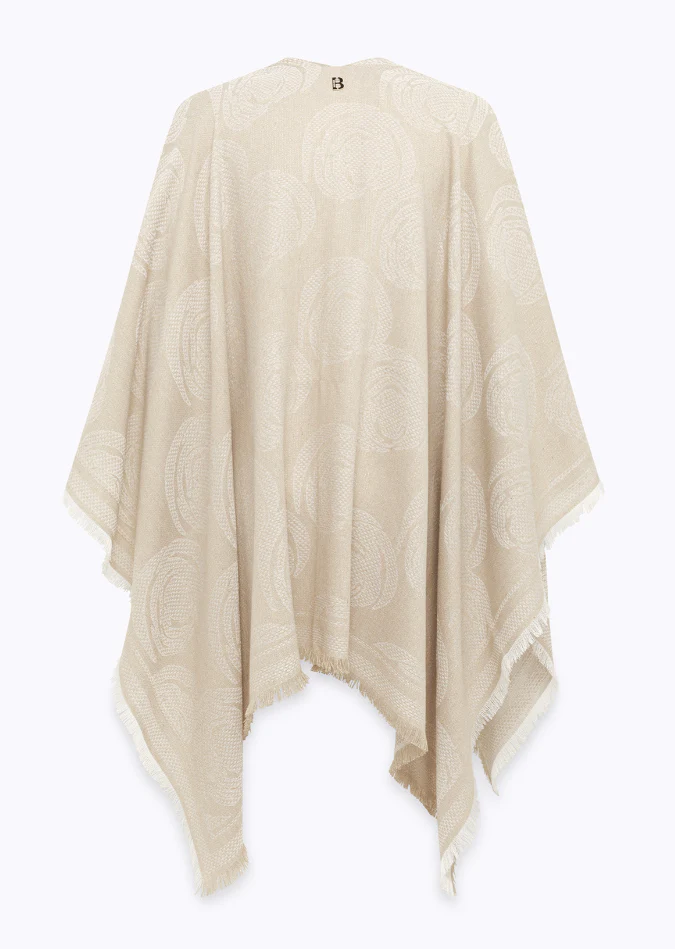 Poncho in maglia jacquard Blugirl, modello con ricami rose e profili sfrangiati, colore beige