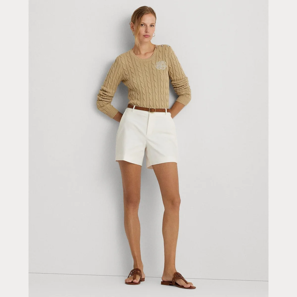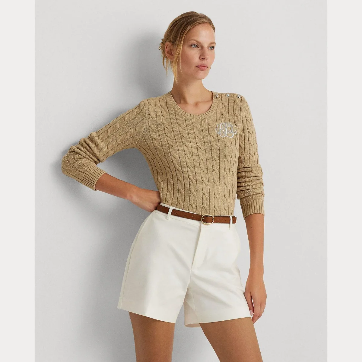 Maglia lavorata Lauren Ralph Lauren, girocollo e maniche lunghe, design intrecciato e logo ricamato sul petto in contrasto, colore beige