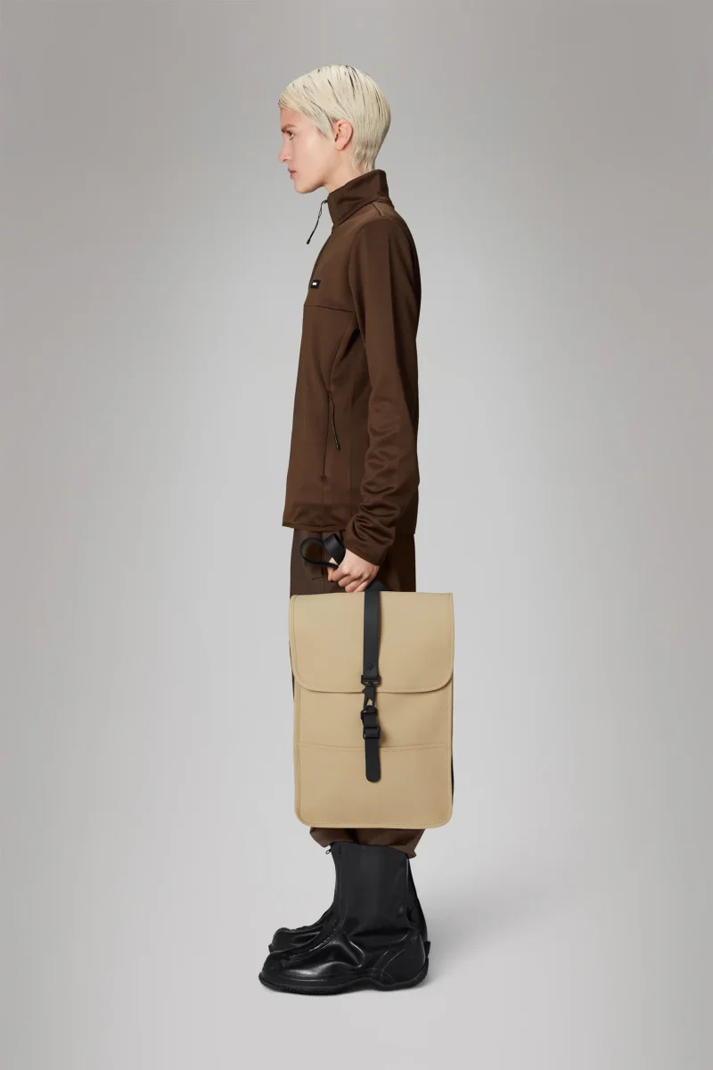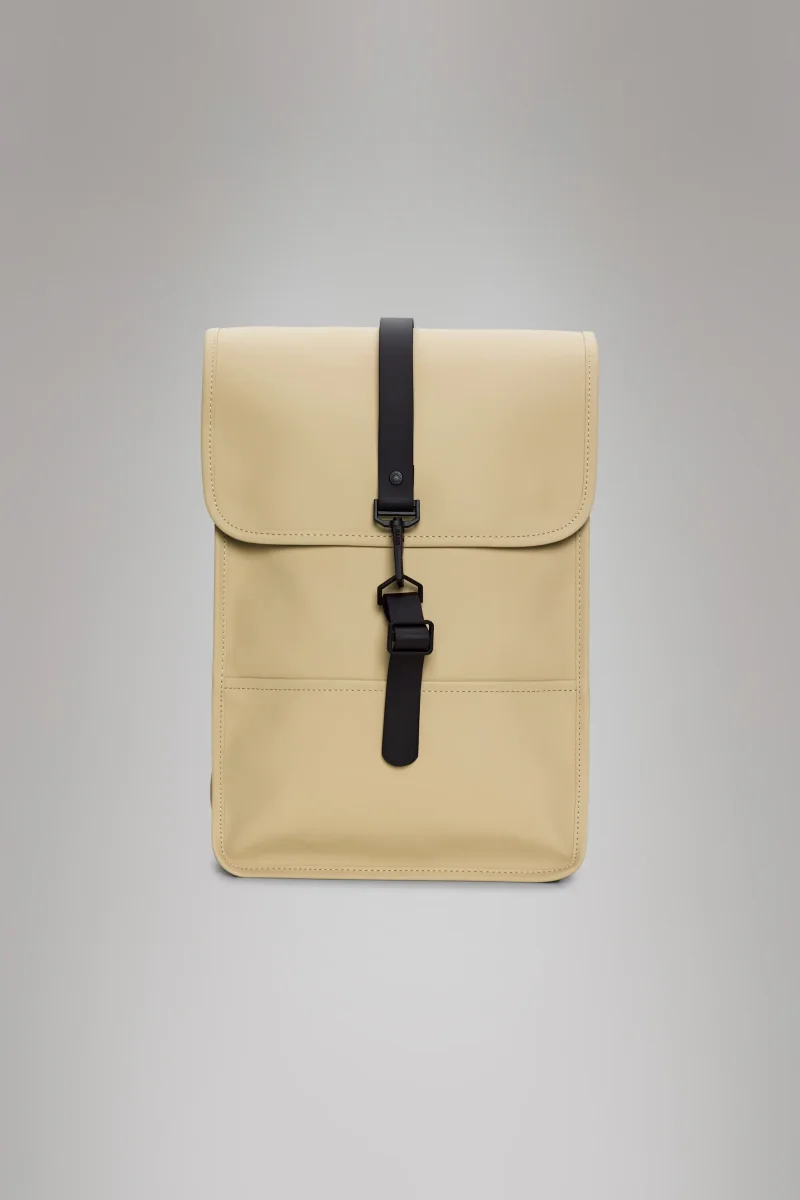 Zaino Puffed Backpack Mini, esterno imbottito con chiusura a moschettone, tessuto iconico impermeabile in PU di Rains, patta a cingha centrale, scompartimento principale con tasca porta oggetti, tasca esterna nascosta per telefono, spallacci regolabili, Scompartimento interno per laptop 13″