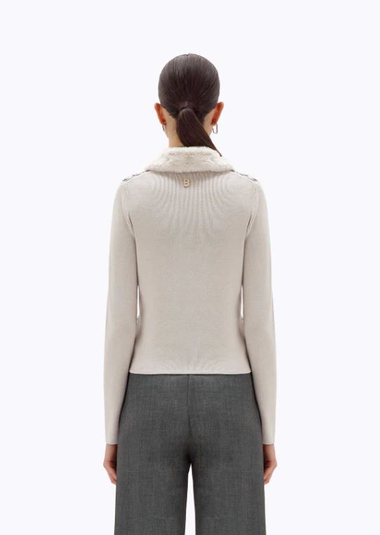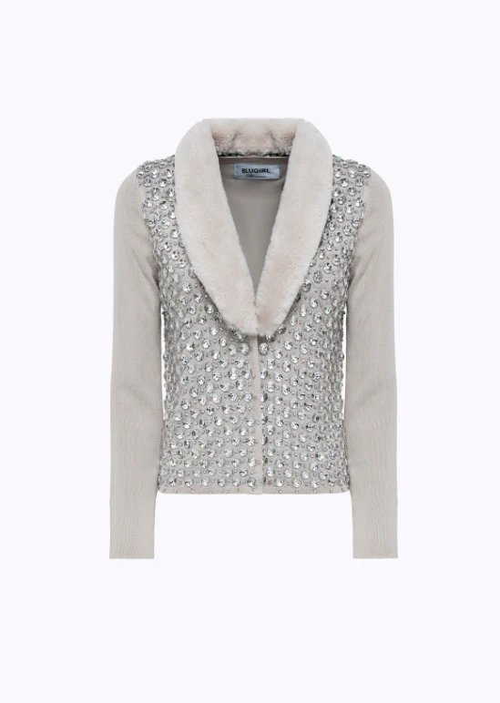 Cardigan in filato di viscosa con ricamo lurex e maxi castoni, collo faux fur rimovibile, scollo a V, e chiusura con bottoni