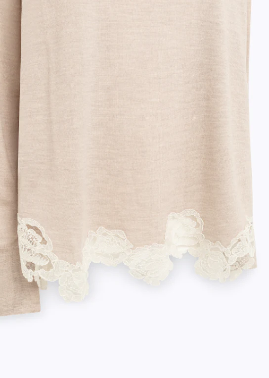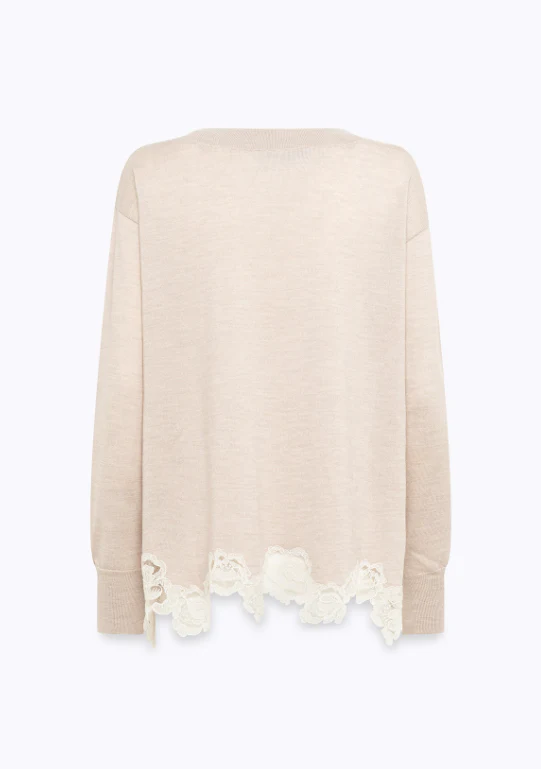 Maglia in pura lana merino con inserti in pizzo al fondo, scollo a barchetta con costa alta, maniche lunghe