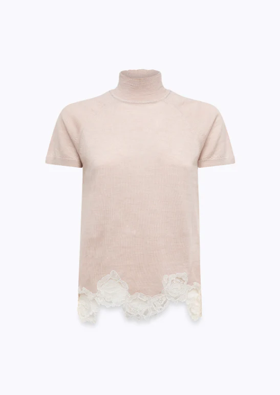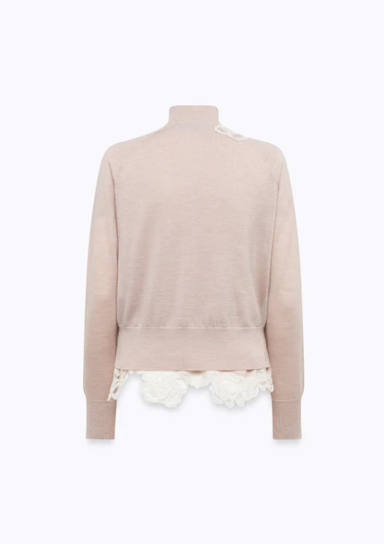 Maglia in pura lana merino con pizzo applicato e motivo a rose, collo alla coreana, chiusura con bottoni ricoperti, maniche lunghe raglan, top con collo a lupetto e fondo in pizzo smerlato, colore rosa