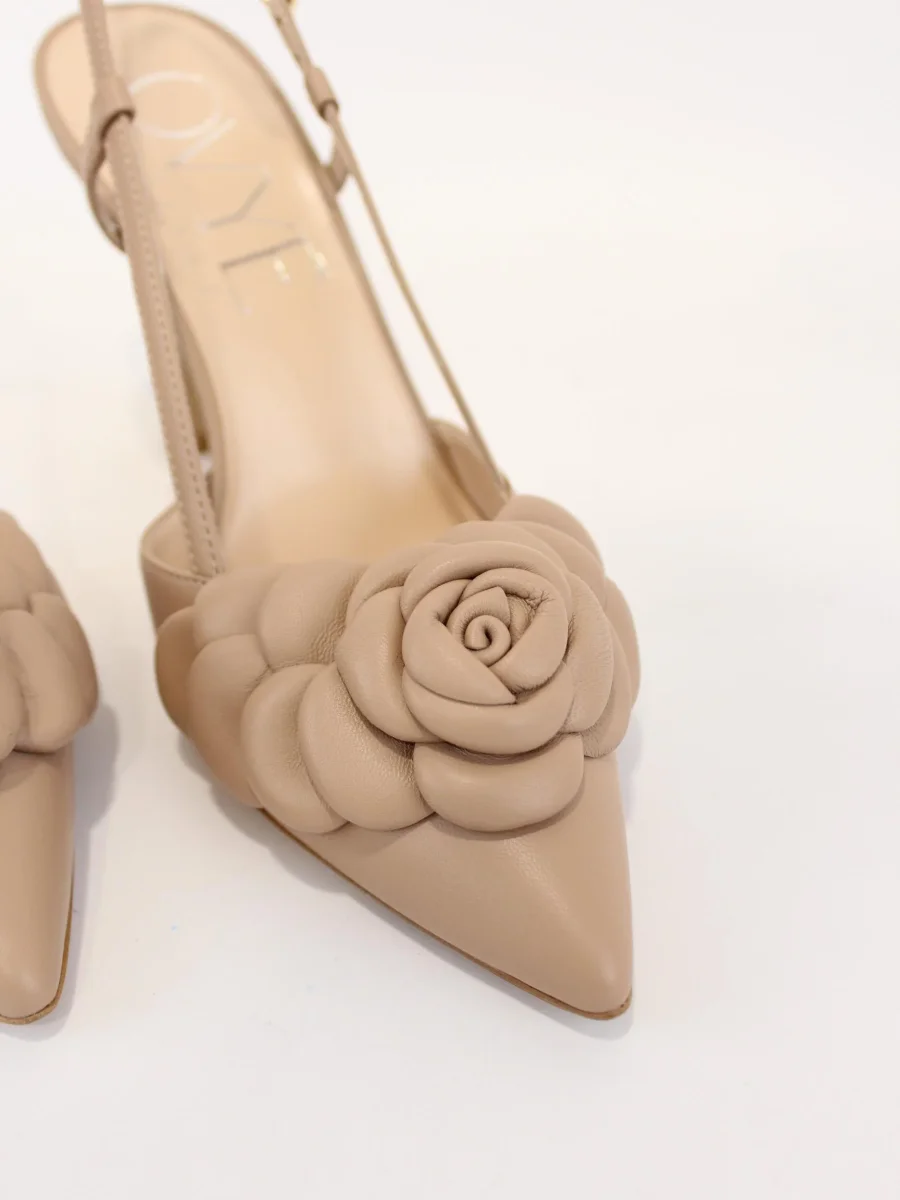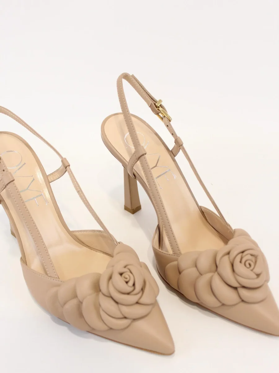 Sandalo Ovyè, modello con applicazione fiore sul davanti, tacco a punta, fibbia con chiusura alla caviglia, modello in ecopelle nude
