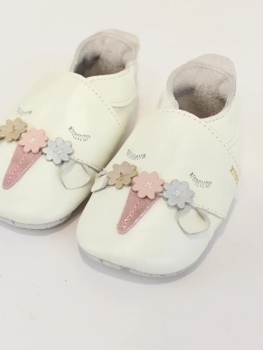 Scarpina in pelle bimba, modello con suola ultra leggera e approvata dai pediatri, applicazione fiori in contrasto sul davanti, colore bianco perla