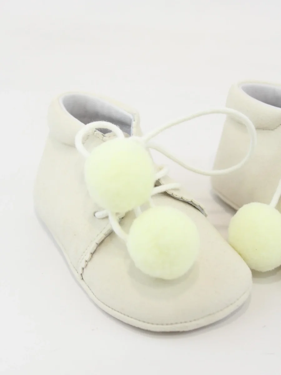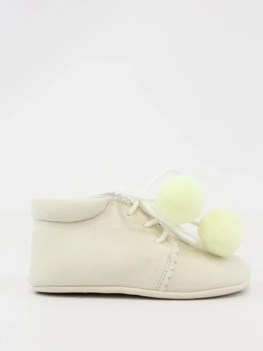 Scarpina Caminito bimbo, modello con chiusura lacci e applicazione pompon in contrasto sul davanti