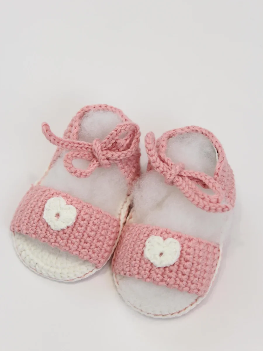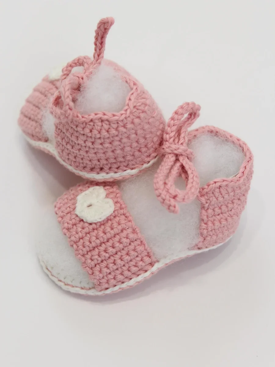 Scarpina nascita Piccola Giuggiola, modello a sandalo in cotone biologico, modello aperto, con chiusuralaccio fiocco, applicazione sul davanti