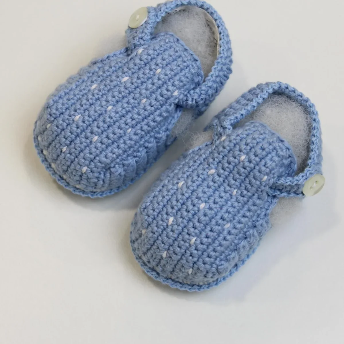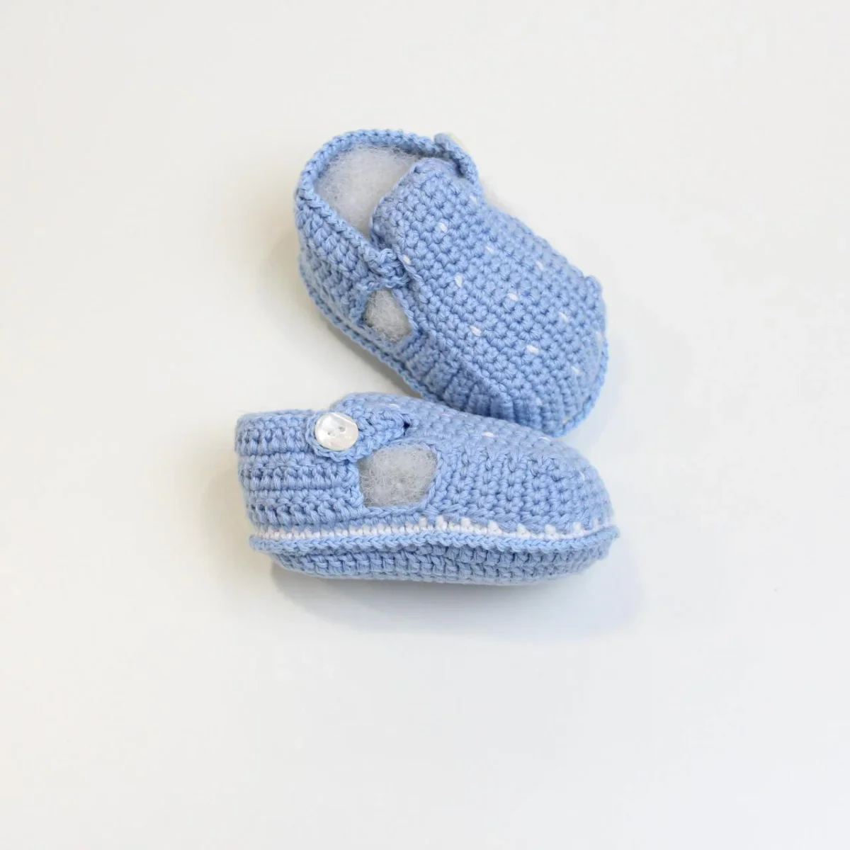 Scarpina neonato Piccola Giuggiola, motivo ricamato in cotone azzurro, con dettagli in contrasto, chiusura con bottoncino laterale