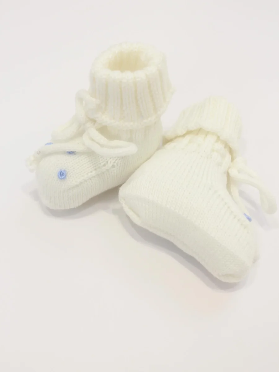 Scarpina neonato Piccola Giuggiola, realizzata in 100% lana, risvolto superiore a costine, laccio in tono, dettagli lavorati a mano in contrasto