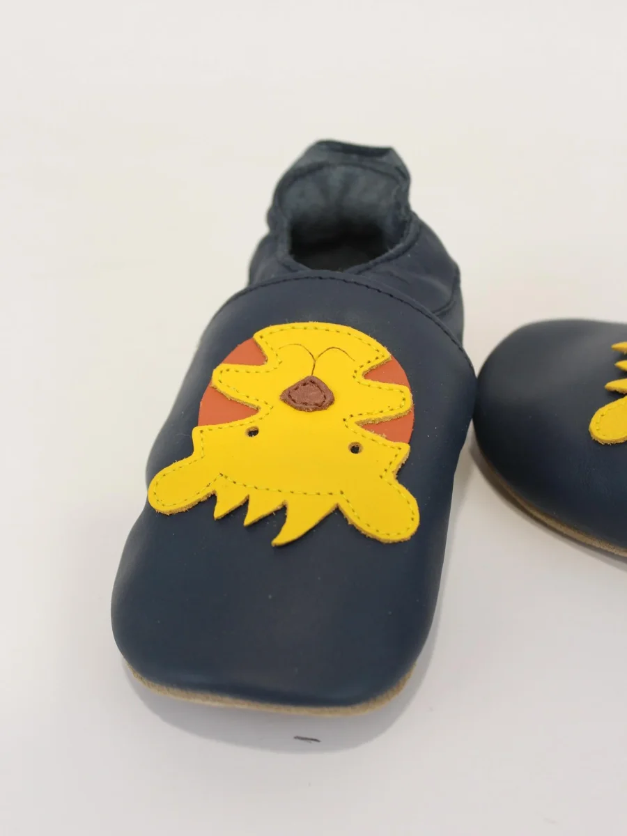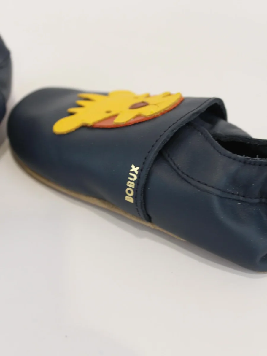 Scarpina in pelle Bobux bimbo, modello soft sole tiger navy, soletta ultra leggera, applicazione dettaglio in contrasto.