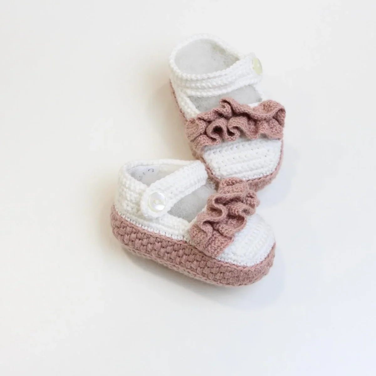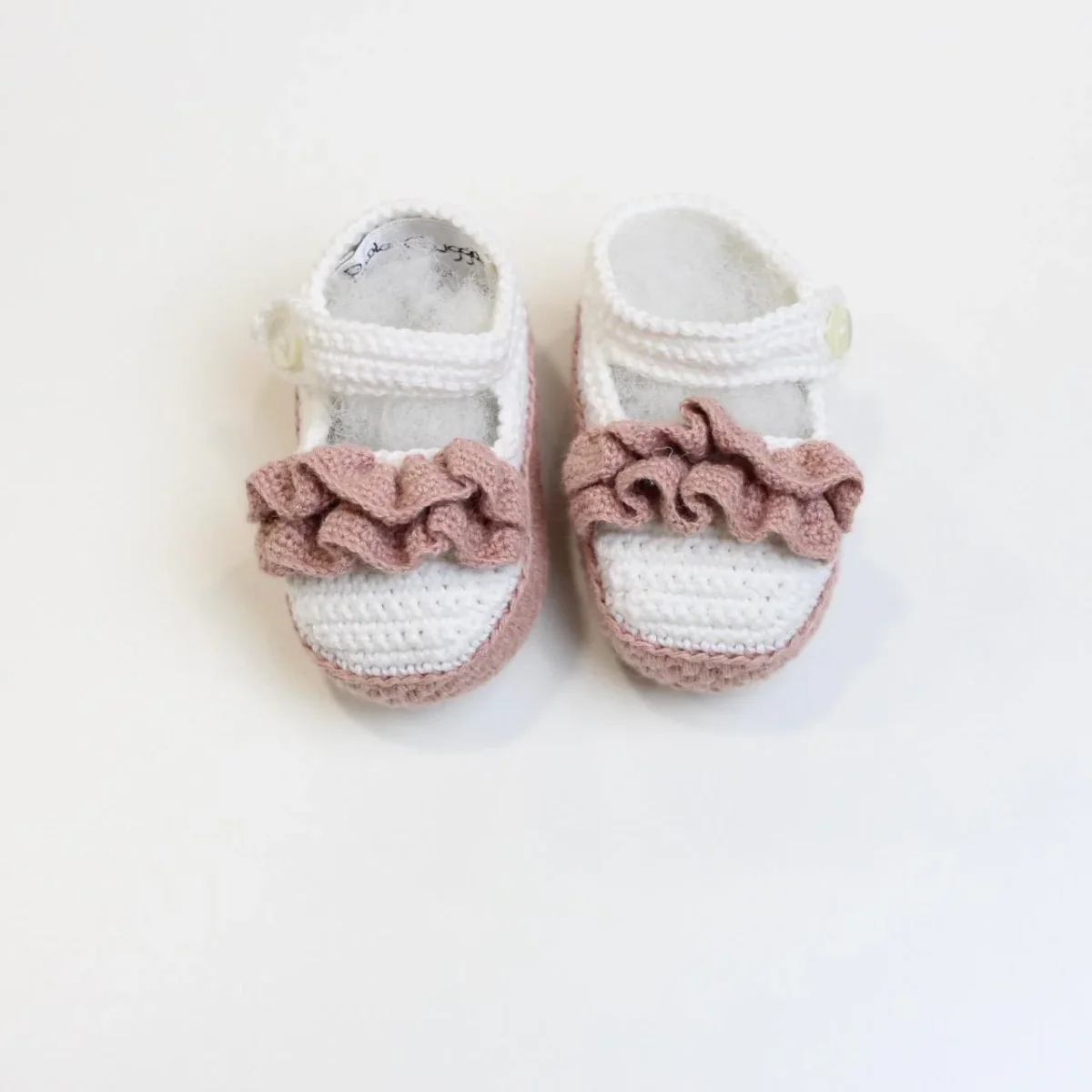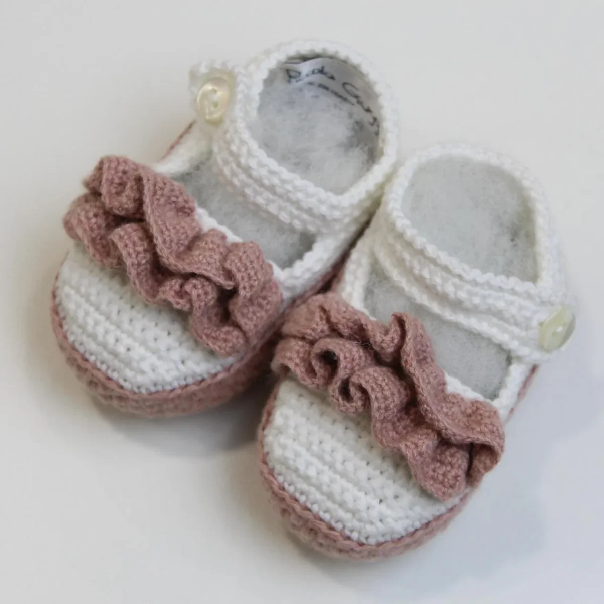 Scarpine nascita Piccola Giuggiola, in cotone con dettaglio sul davanti, fondo in contrasto e chiusura con strappo.