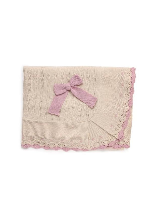 Scialle in cotone lavorato con applicazione fiocco in raso, colore beige