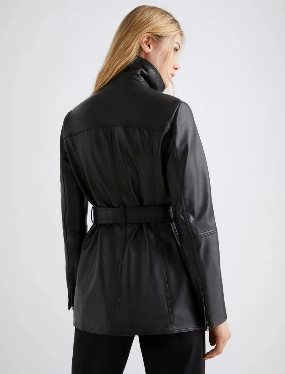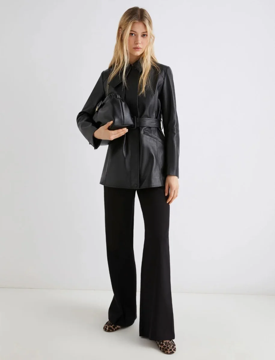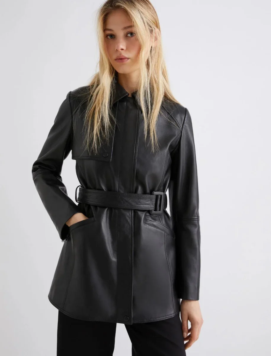 Giaccone in pelle linea Marella, collo a camicia con paragola, chiusura con zip nascosta e bottone a pressione, cintura in vita e tasche laterali, colore nero
