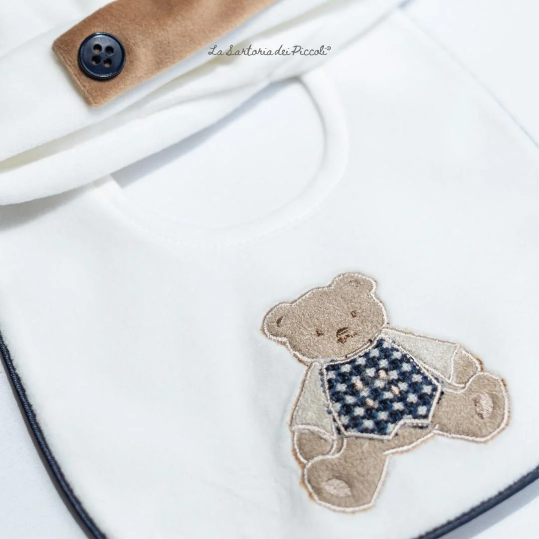 Set cappellino La Sartoria Dei Piccoli, modello con cappellino e bavetta, realizzato in ciniglia di cotone con ricamo orsetto in contrasto