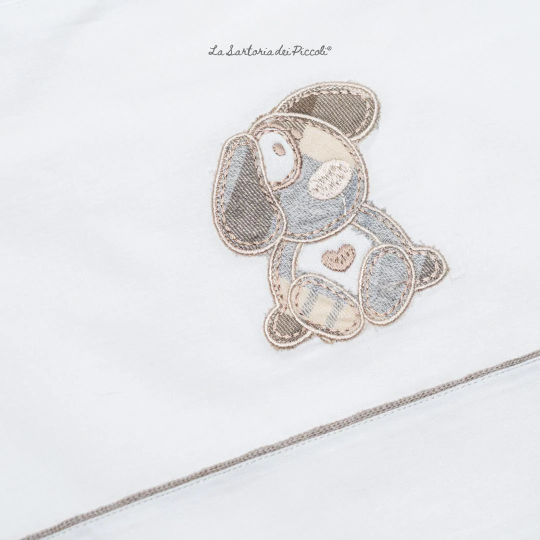 Set composto da lenzuolino sopra e federa La Sartoria Dei Piccoli, realizzato in morbido e puro cotone, risvolto impreziosito con cagnolino stile patchwork