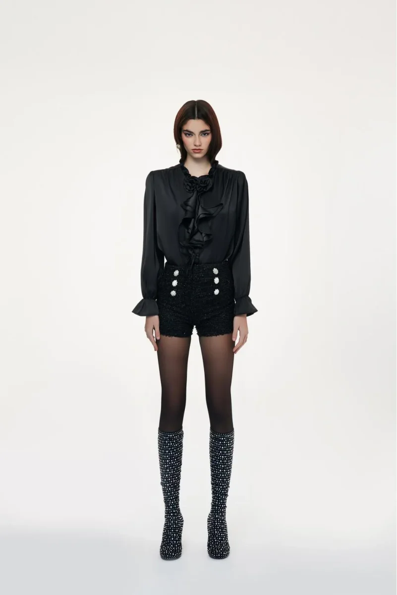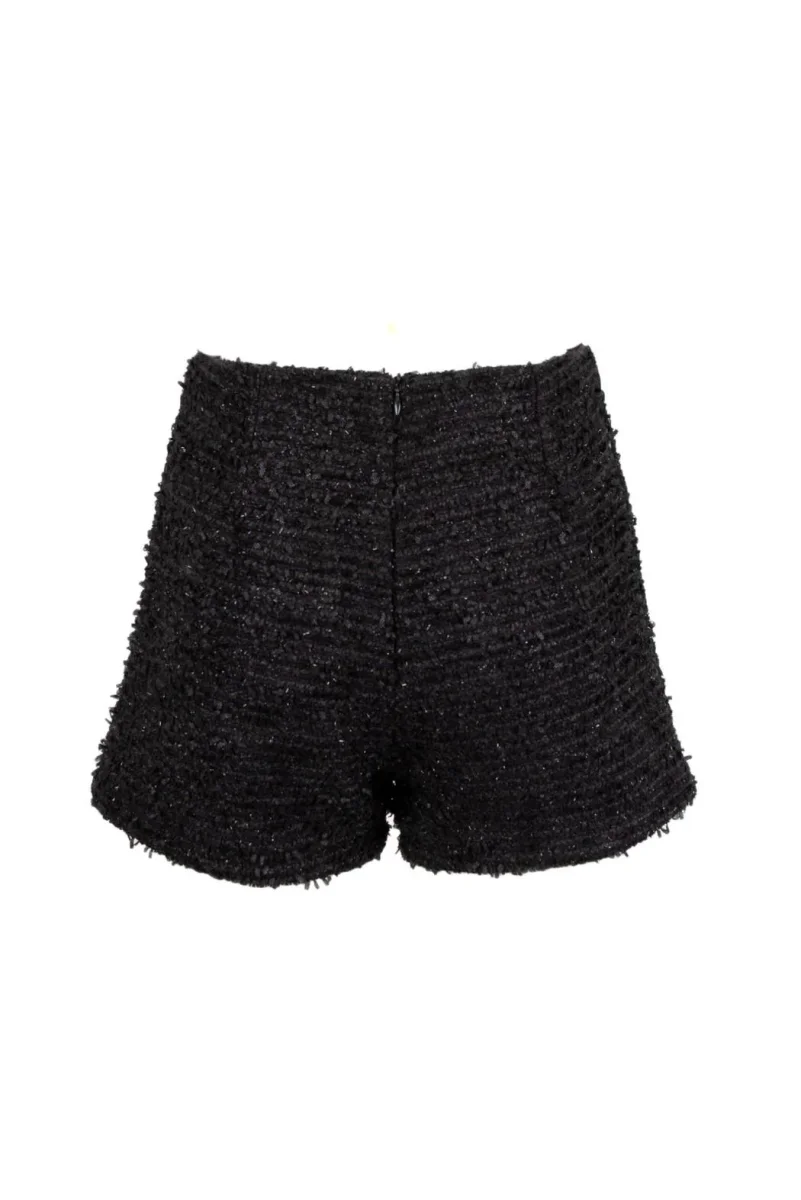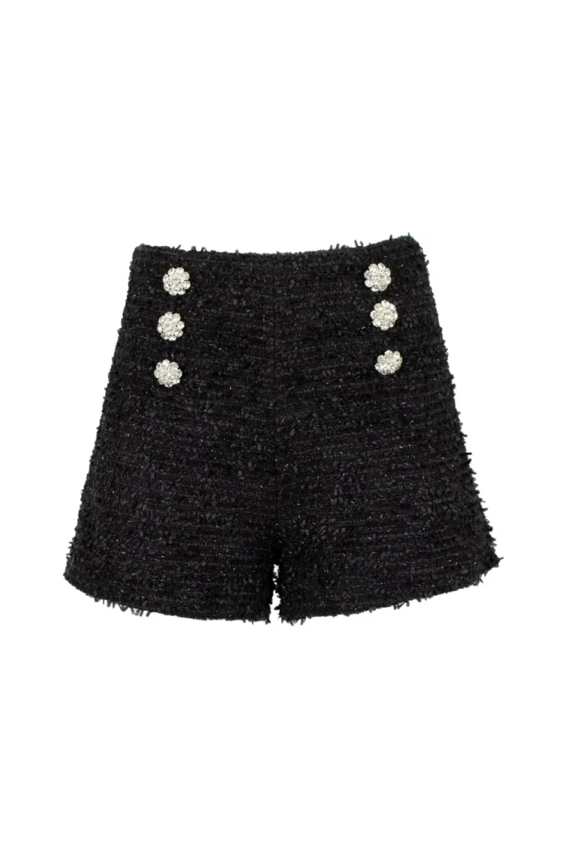 Shorts donna, modello in tweed a vita alta con taglio svasato e orlo sfrangiato, doppia fila di bottoni gioiello decorativi sul davanti, finitura con strass, colore nero