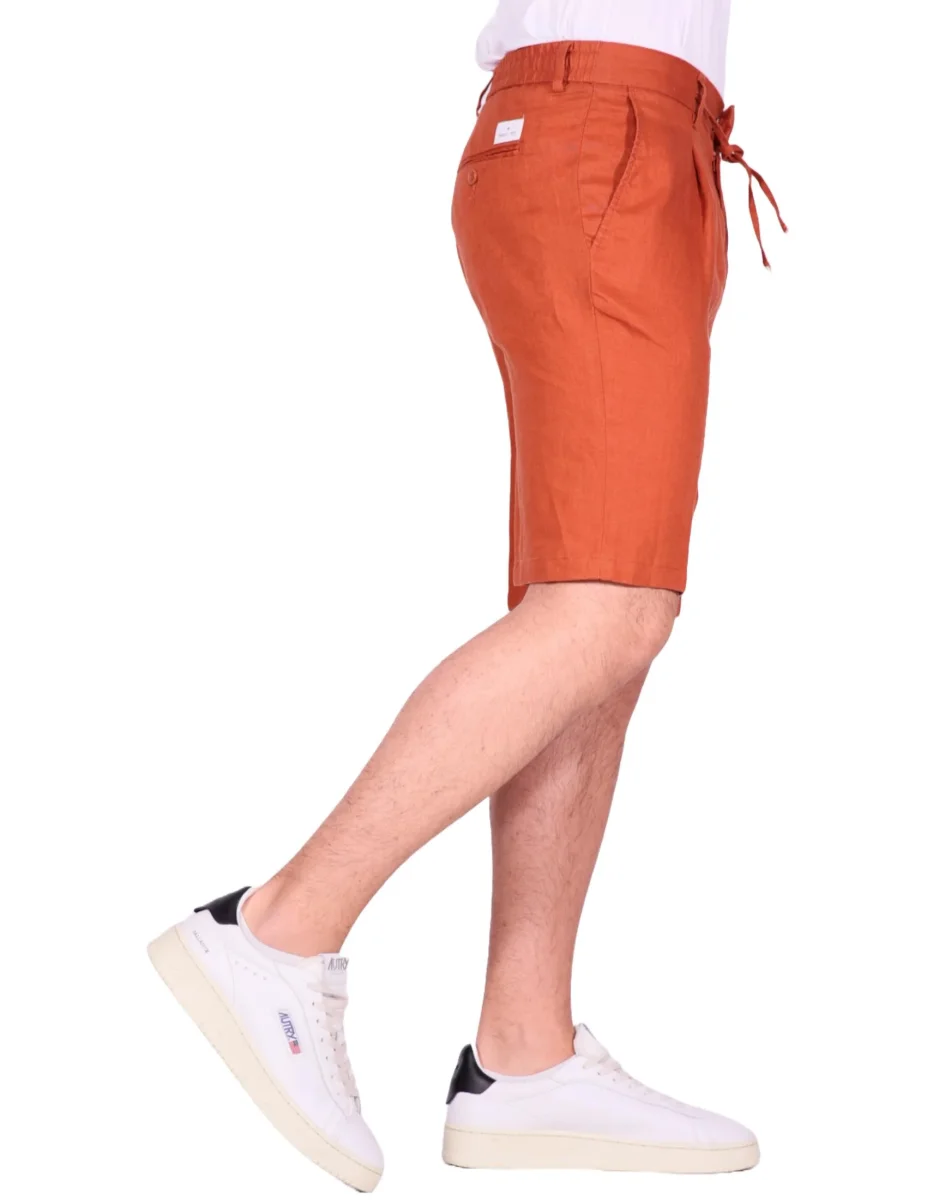 Bermuda Manuel Ritz uomo in puro lino, modello con pinces e baggy fit in lino lavato, tasche america frontali, tasche con bottone sul retro, chiusura con zip, gancio e coulisse, color mattone