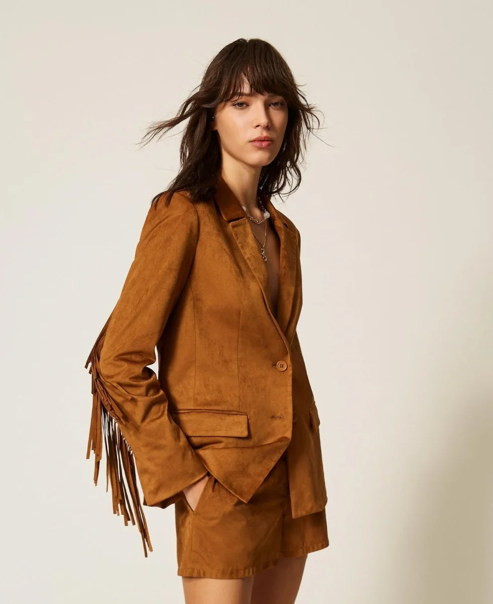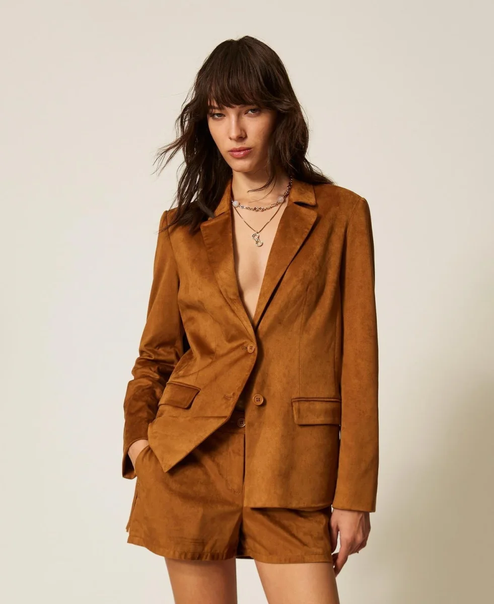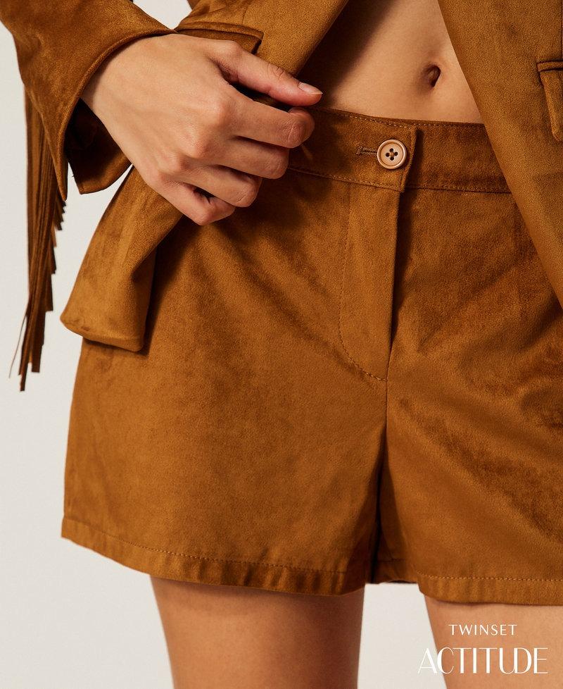 Shorts scamosciati Twinset Actitude, modello effetto suede con passanti in vita, tasche ai fianchi, chiusura con zip e bottone, linea dritta, colore marrone