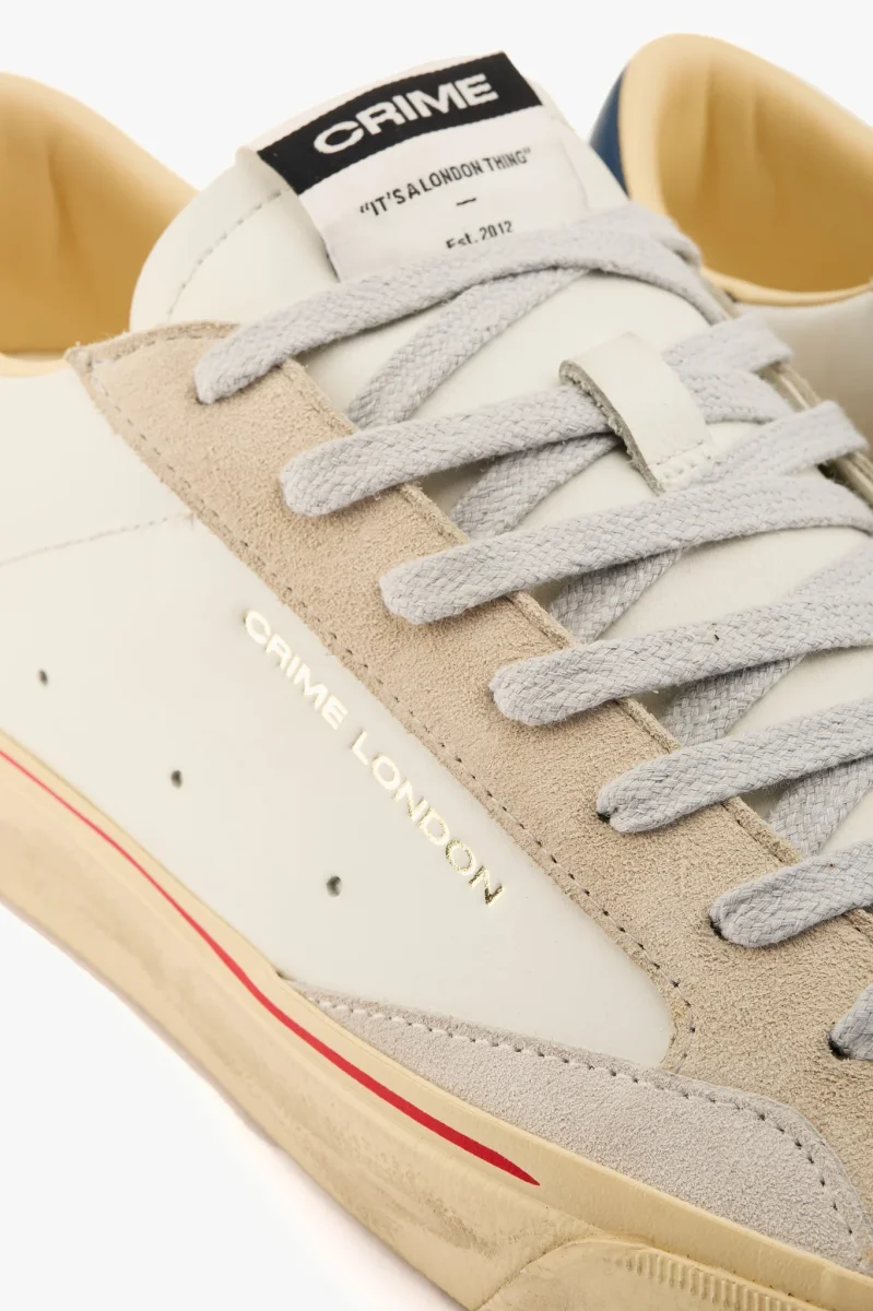 Sneaker in pelle bianca e camoscio beige con talloncino in pelle blu