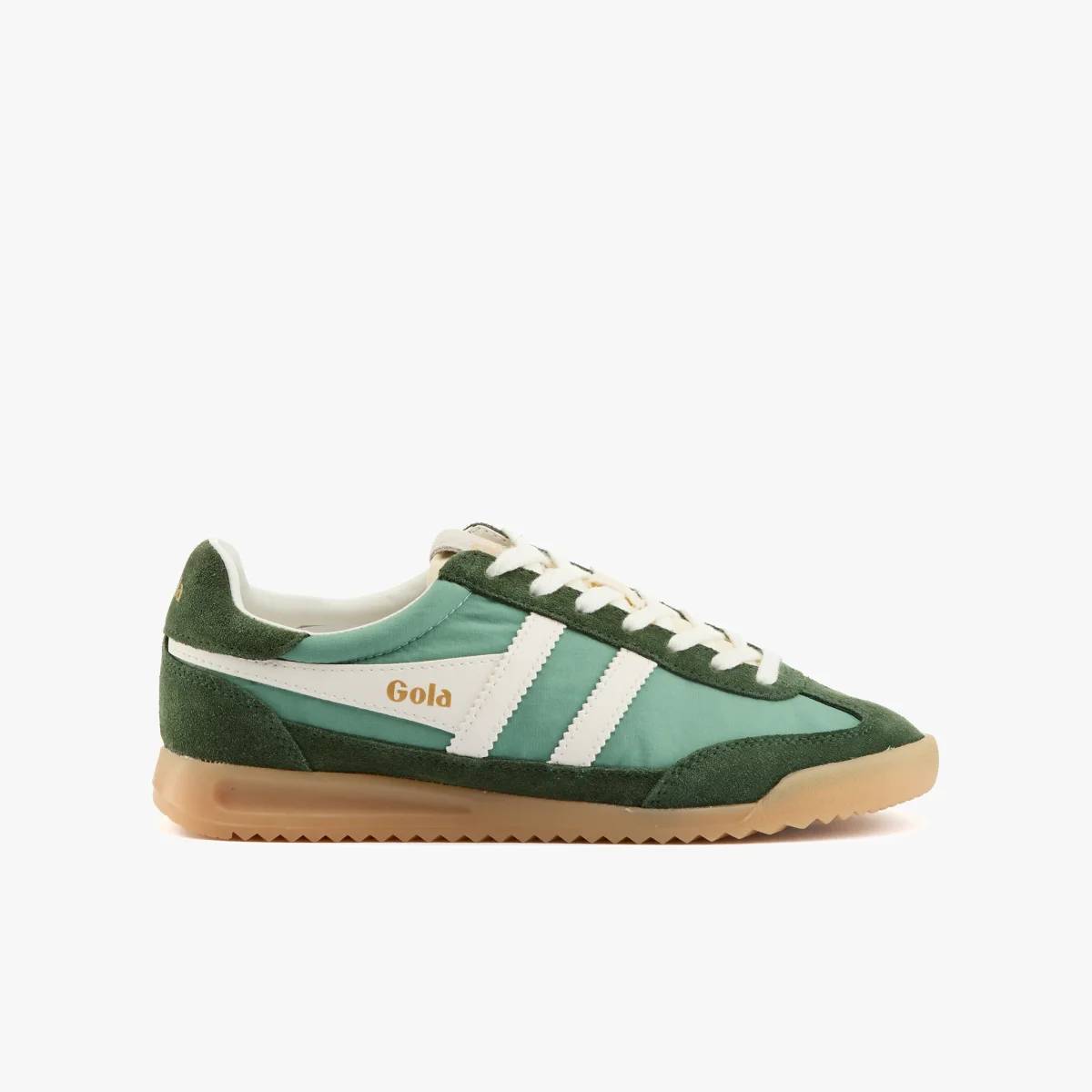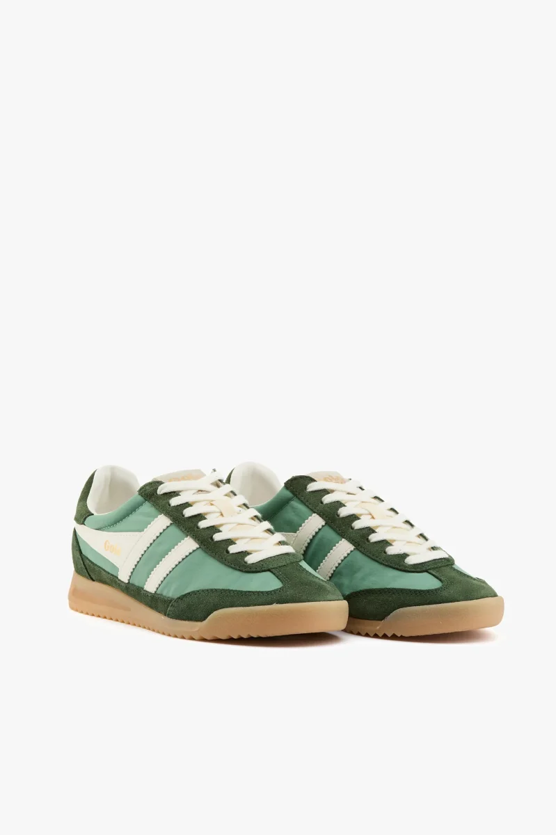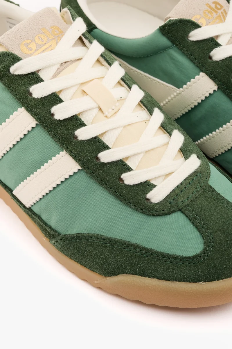 Sneaker in tessuto e camoscio verde con dettagli in pelle bianco