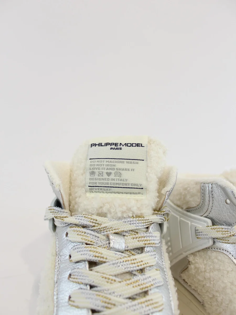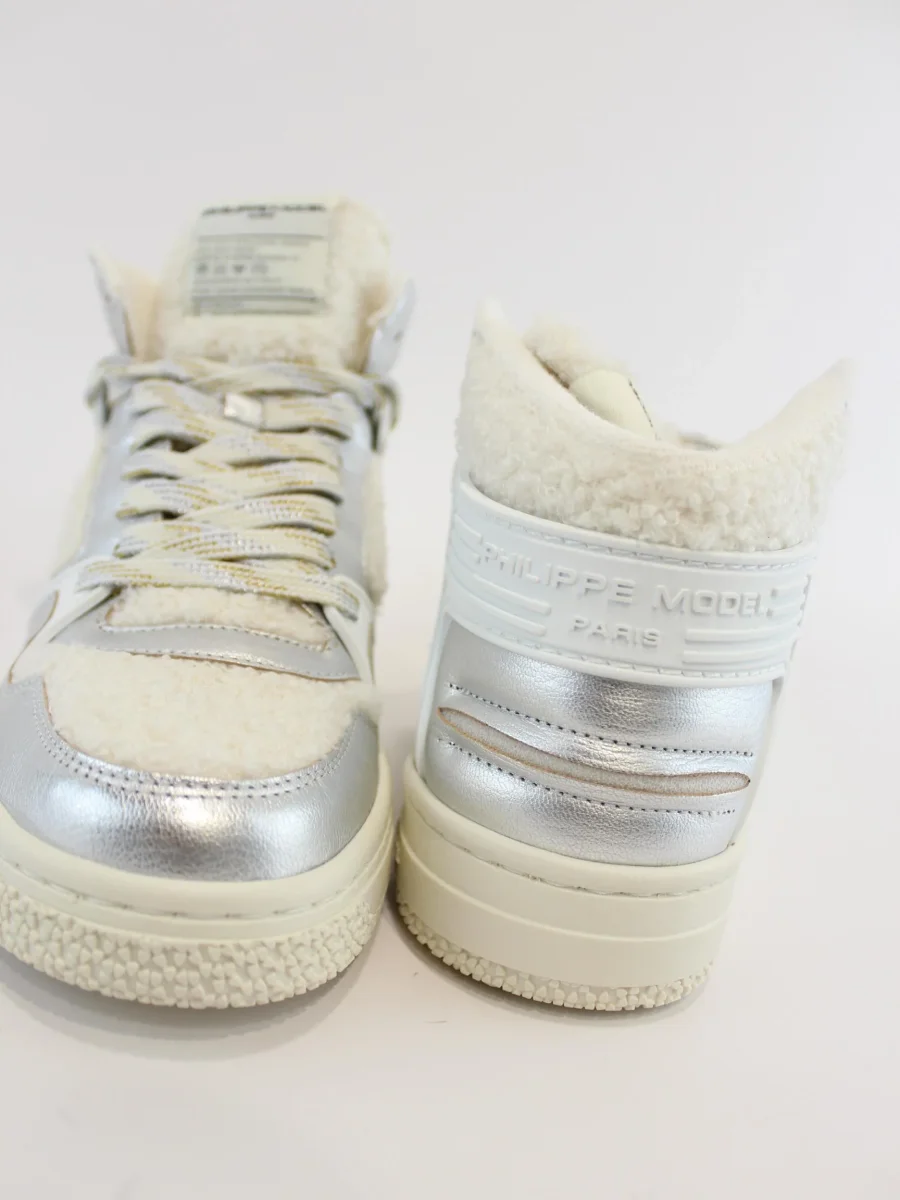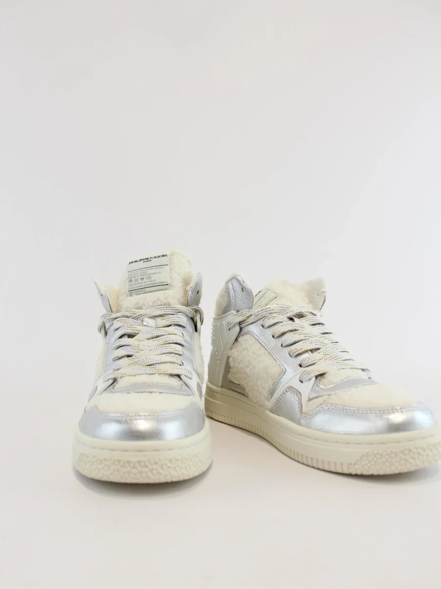 Sneakers mid Philippe Model donna, design basket anni 90′. Inserti laminati argento e tomaia con tessuto ecomontone, lacci lurex e suola a cassetta in gomma leggera. Suola 4 cm