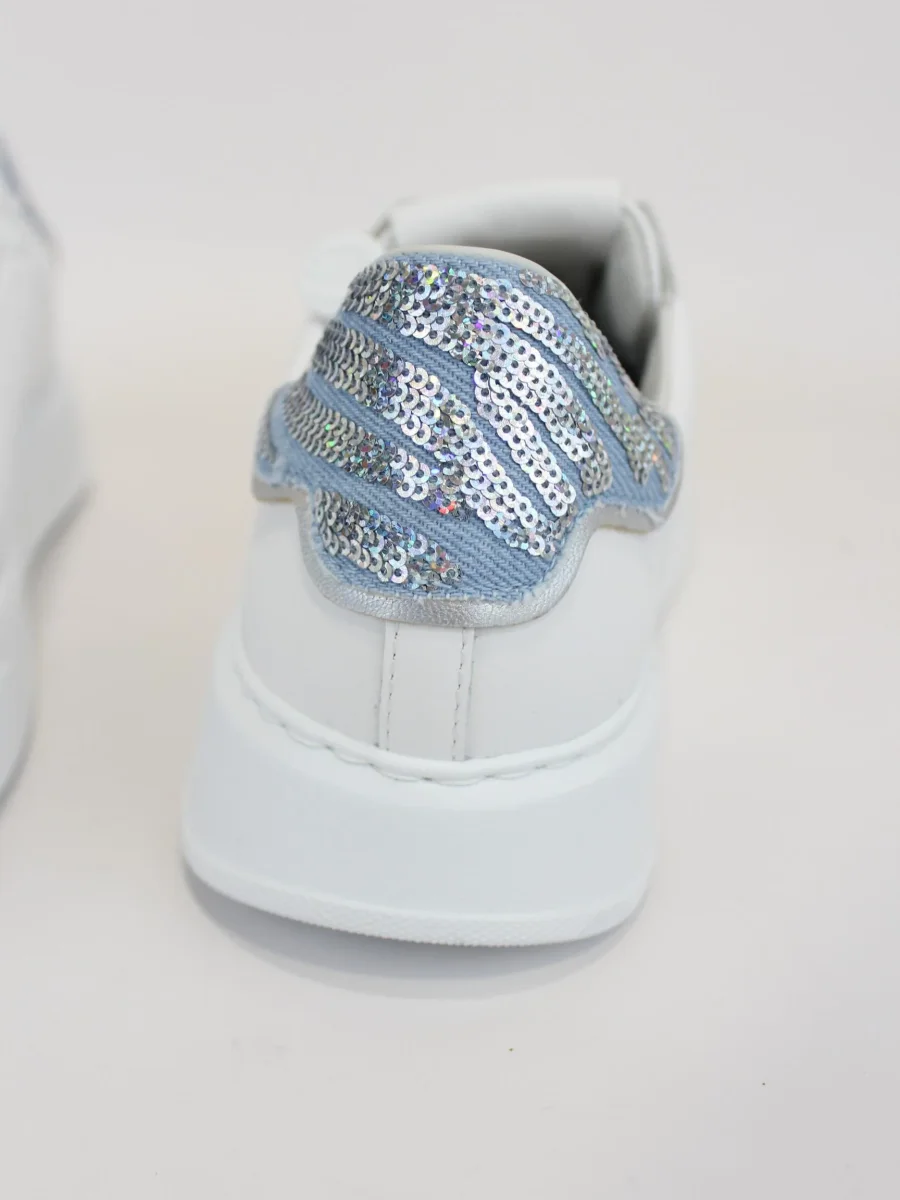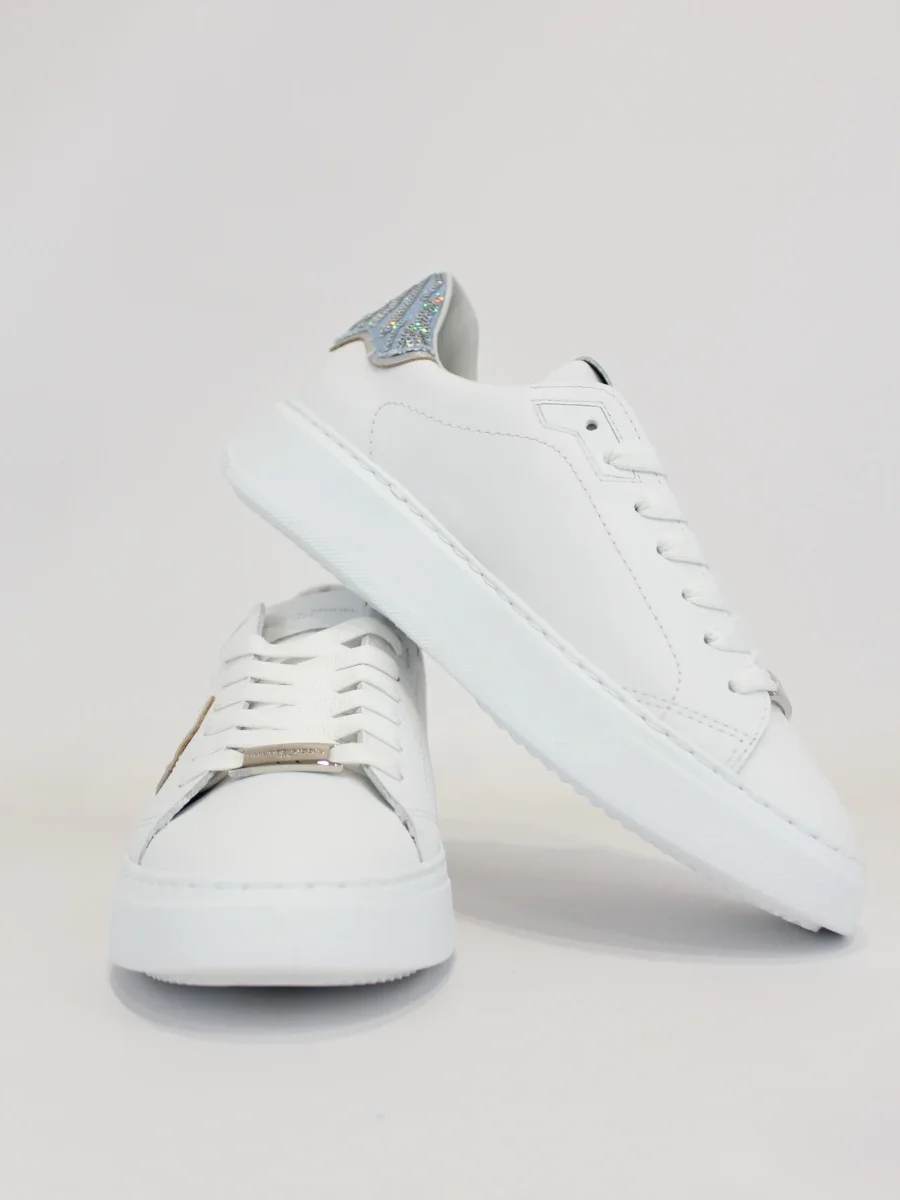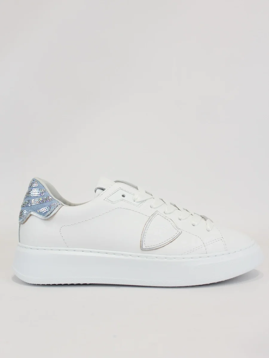 Sneakers donna Philippe Model, modello con punta arrotondata, chiusura con lacci in contrasto, iconico logo su un lato, e dettaglio posteriore con scritta e glitter
