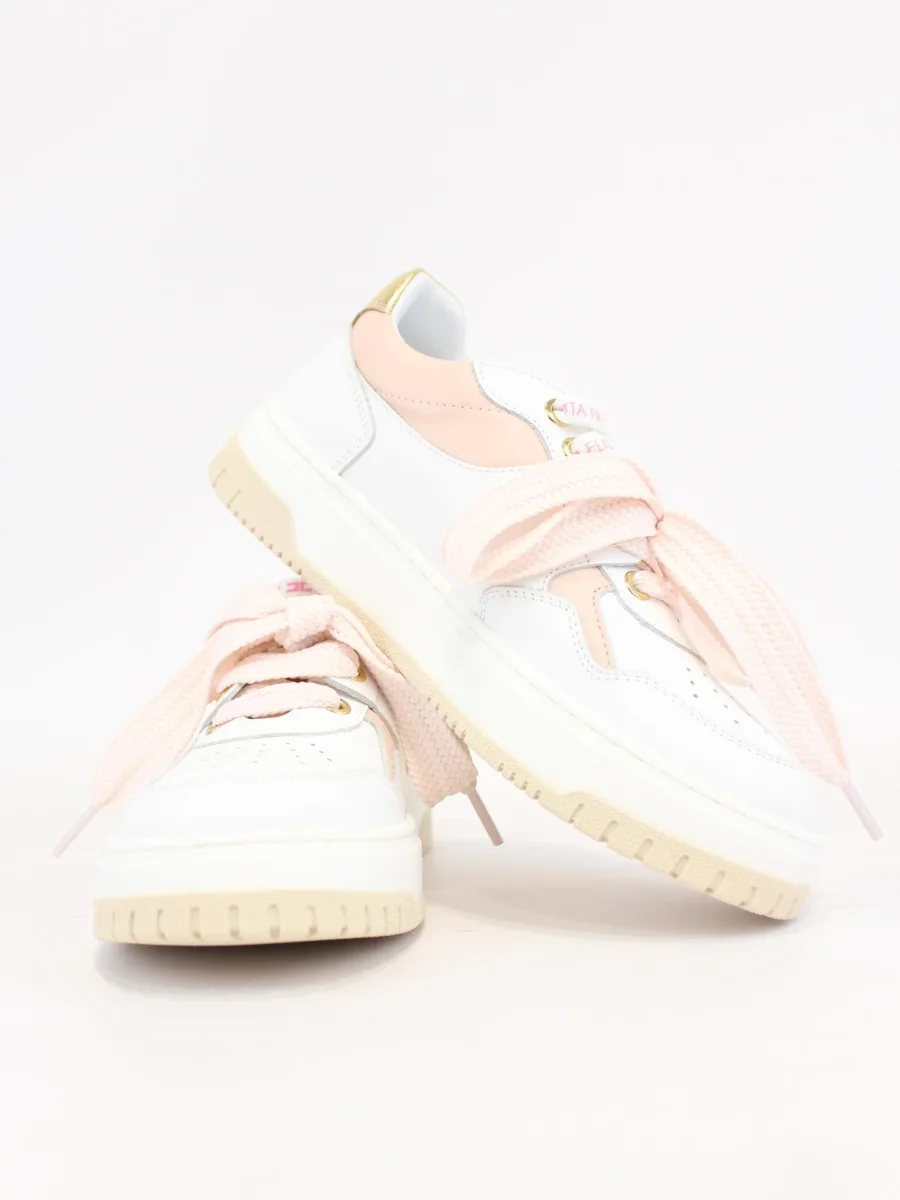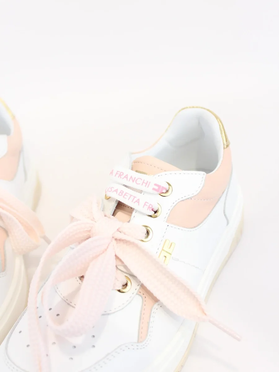 Sneakers in pelle Elisabetta Franchi, modello caratterizzato da doppio laccio, di cui uno in raso e uno logato in contrasto, dettagli in contrasto oro