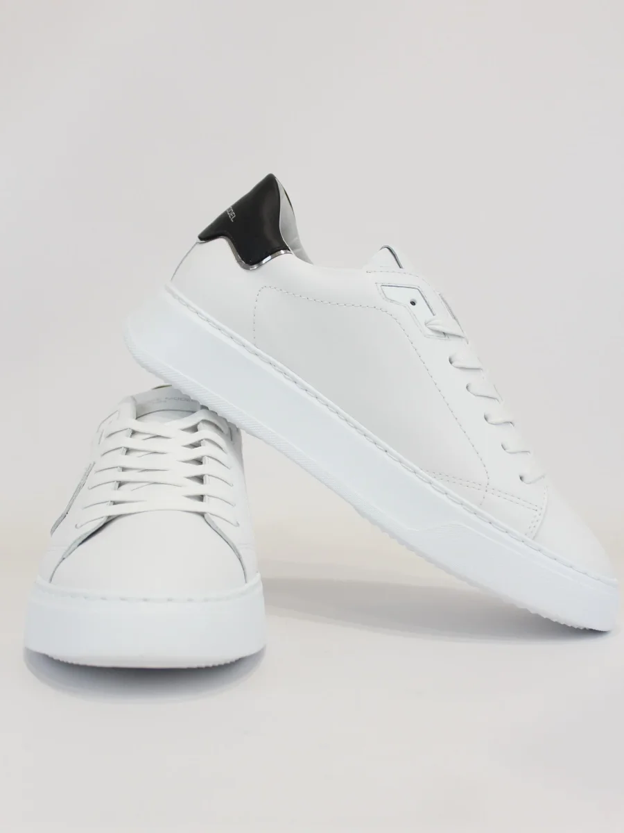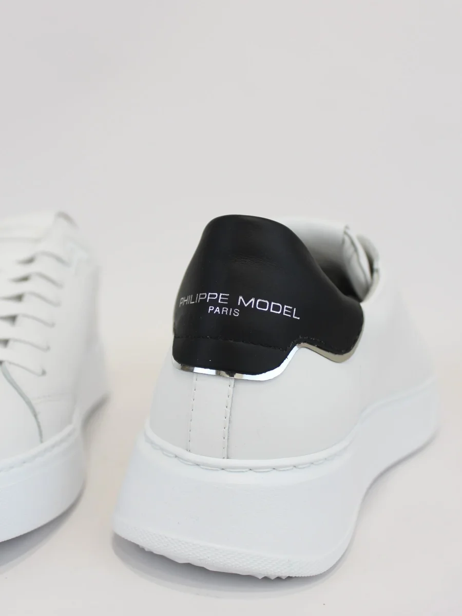 Sneaker Temple Philippe Model total white, realizzata in morbida pelle di vitello, scudetto laterale iconico in contrasto, e suola bold in gomma ultra leggera, colore bianco e retro nero. Altezza suola 4 cm
