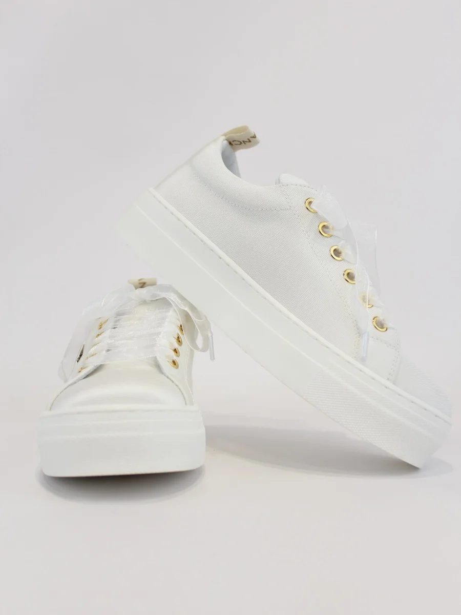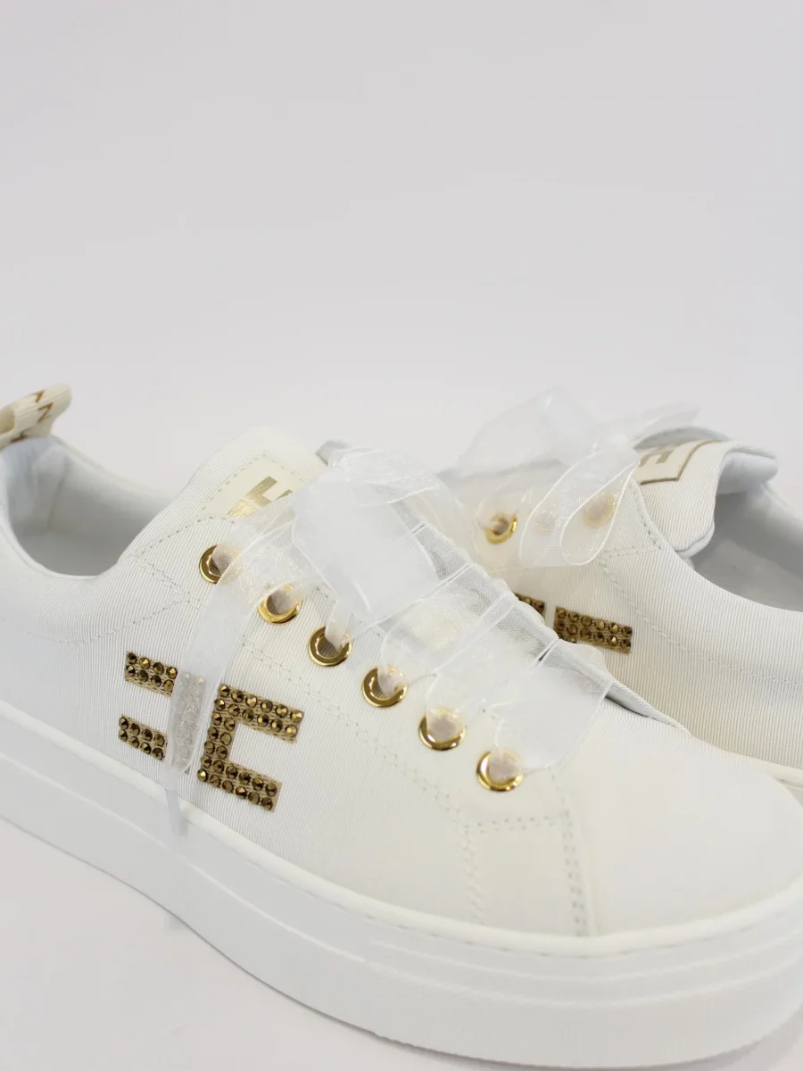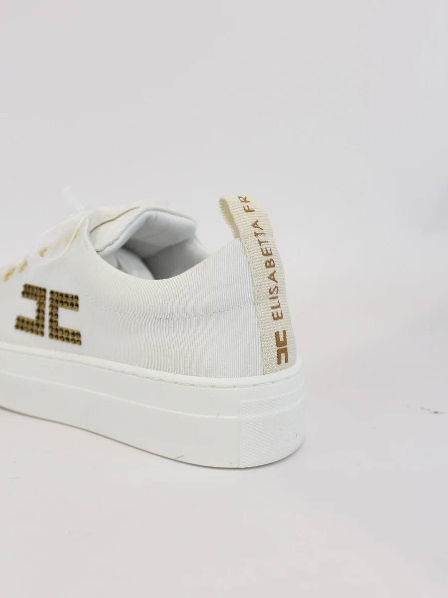 Sneakers in pelle, modello con chiusura lacci, dettaglio logo strass in contrasto laterale e logo linguetta posteriore, colore bianco