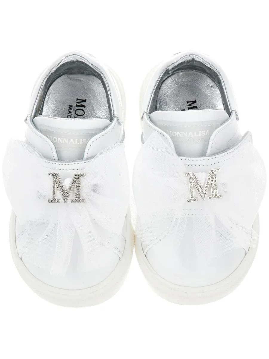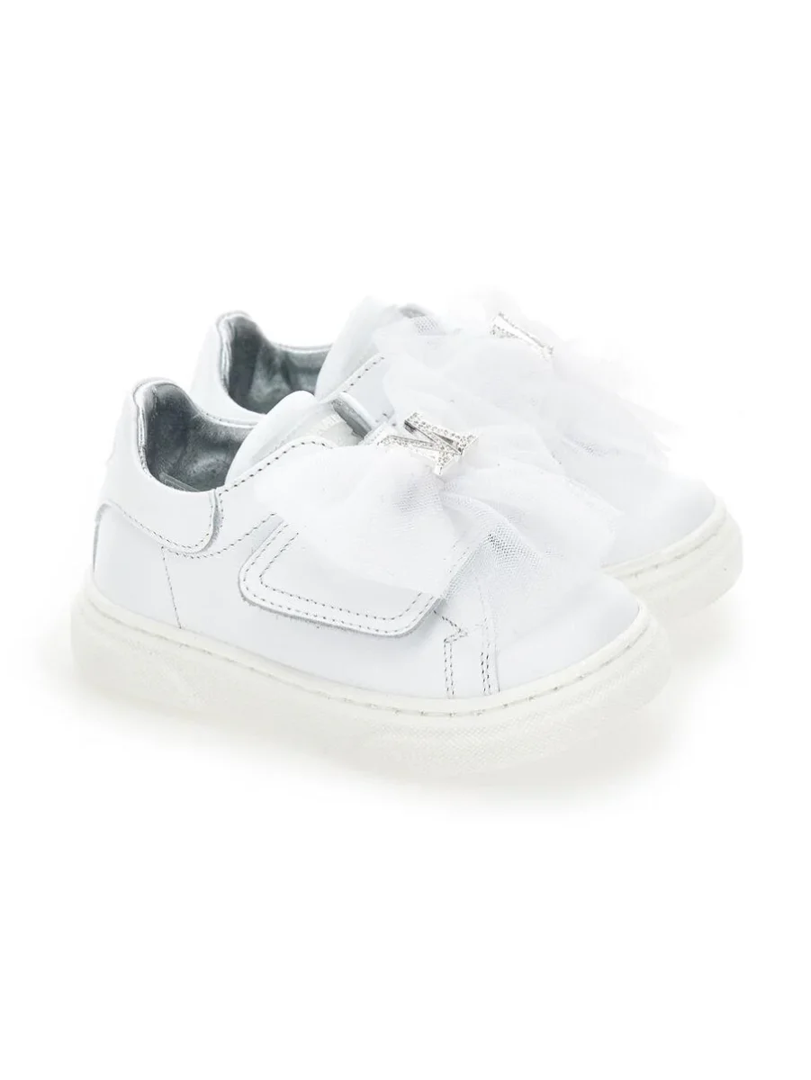 Sneakers in vera pelle Monnalisa, fiocco decorativo in tulle, ministrass, colore bianco