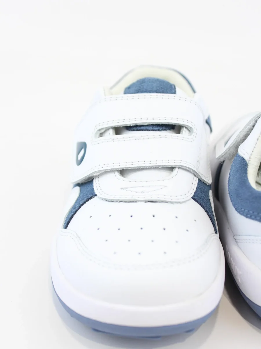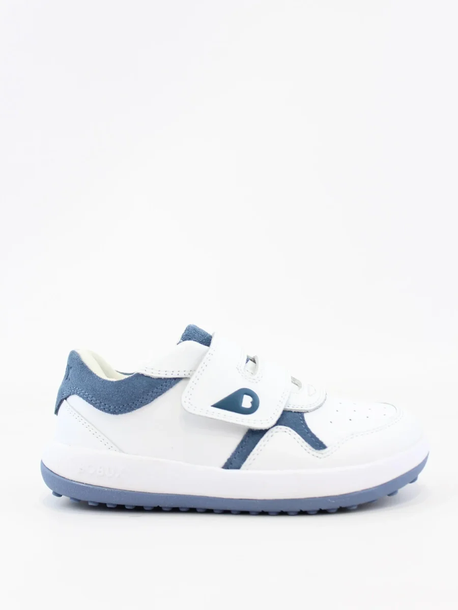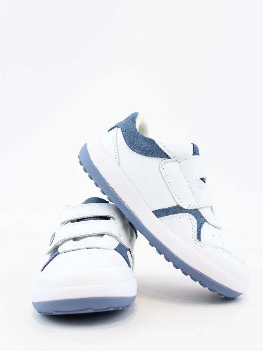 Sneakers con strapp Bobux, modello con punta arrotondata, dettaglio logo in contrasto, colore bianco e blu
