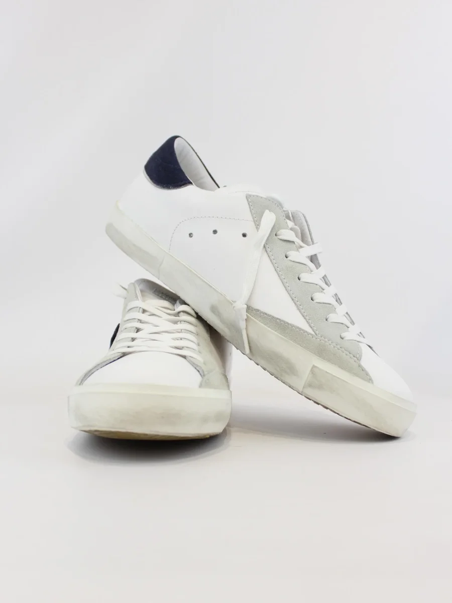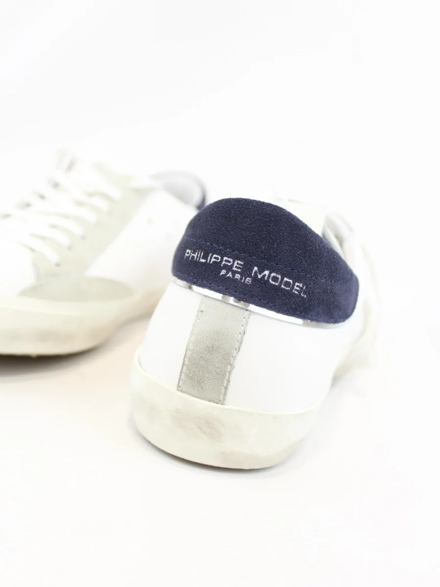 Sneakers Philippe Model uomo, modello street heritage, tomaia in pelle di vitello bianco con finitura used, suola in gomma, colore bianco e retro blu