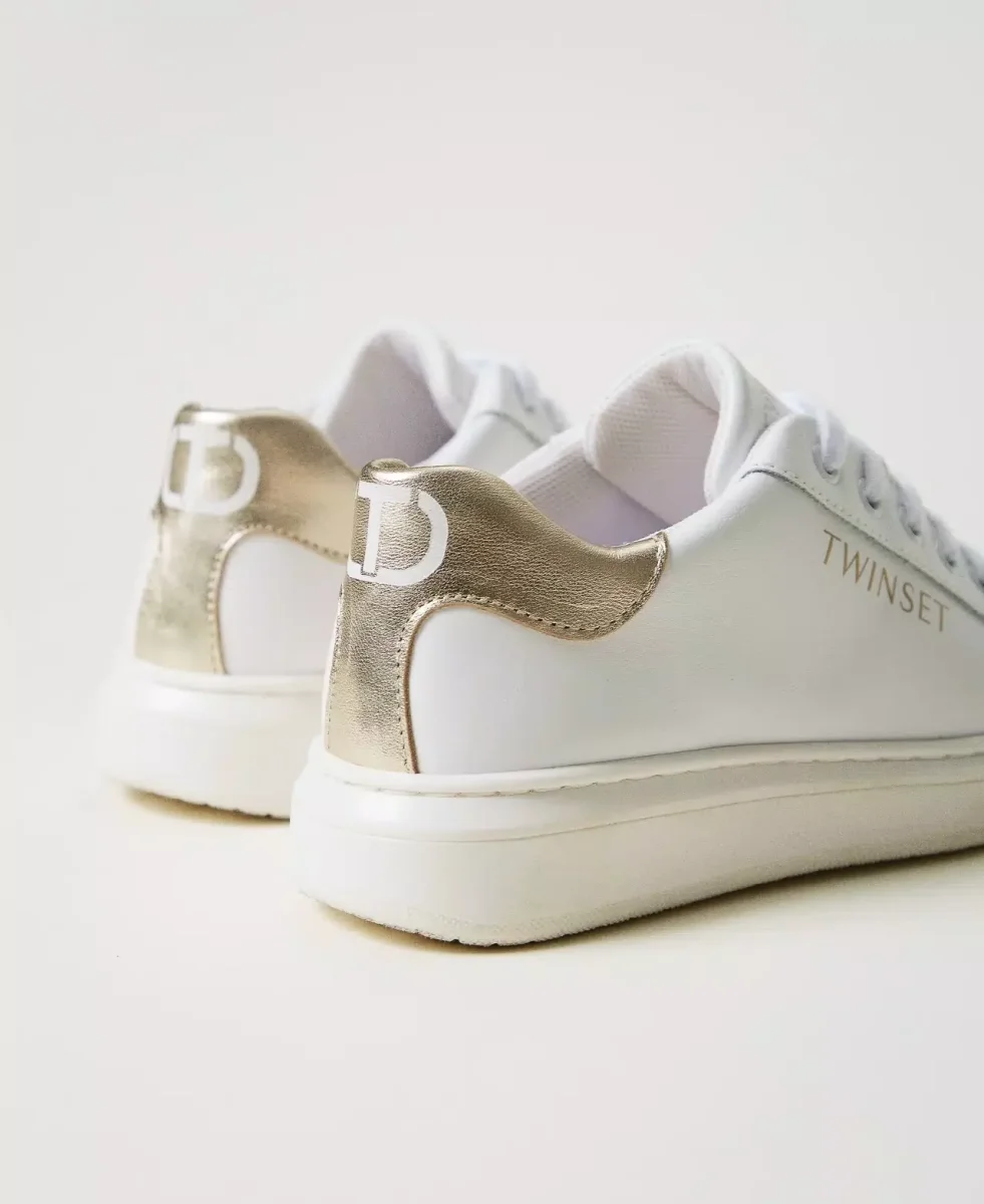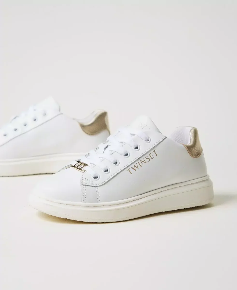 Sneakers Twinset Girl, modello made in Italy, in pelle con dettagli colorati a contrasto, logo lettering e fondo in gomma, colore bianco