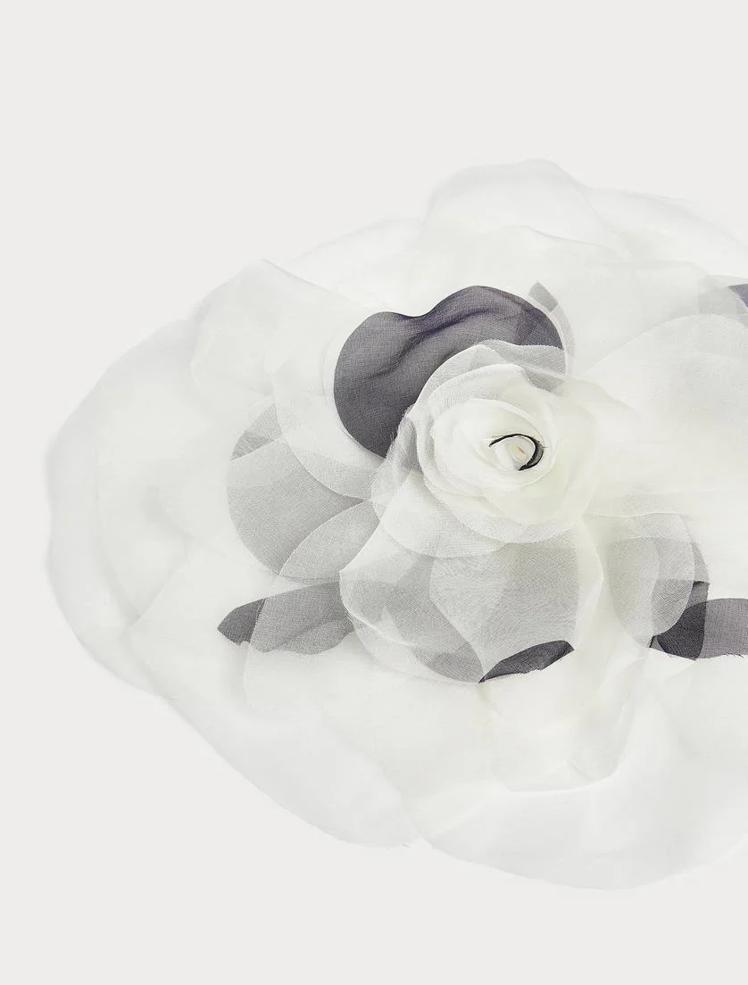 Spilla a fiore in organza stampata seta, fantasia in contrasto, colore bianco