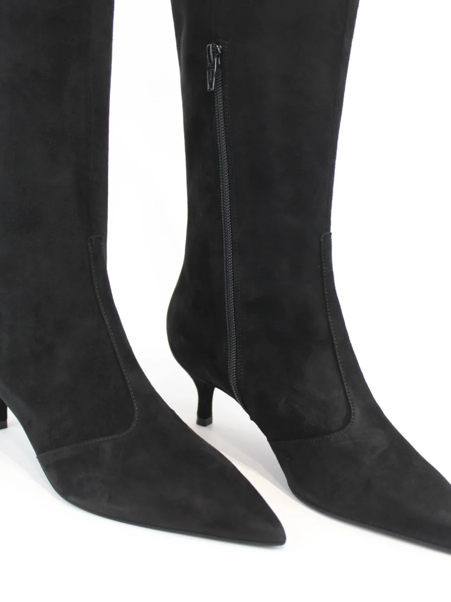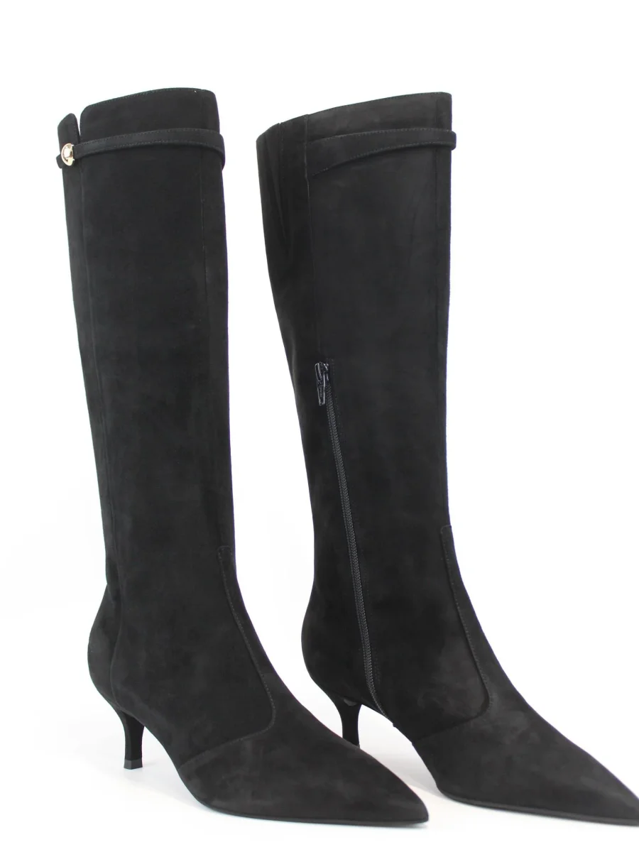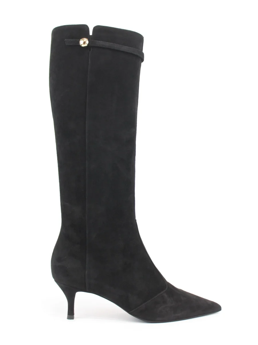 Stivale alto camoscio Furla donna, punta fina, cinturino sul gambale alto con dettaglio logo metallico in contrasto, colore nero