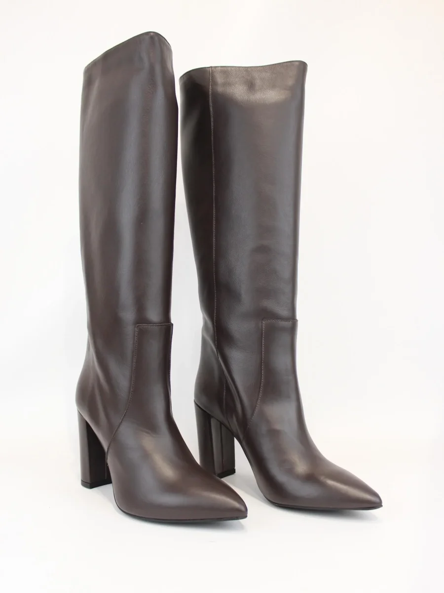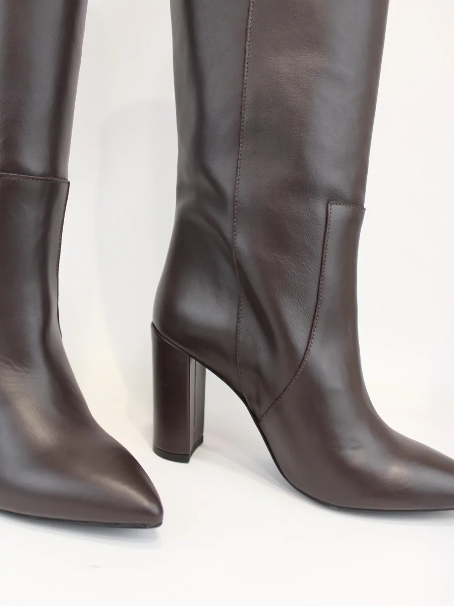 Stivali in pelle Ovyè, modello con gambale alto e tacco 9 cm, colore moro