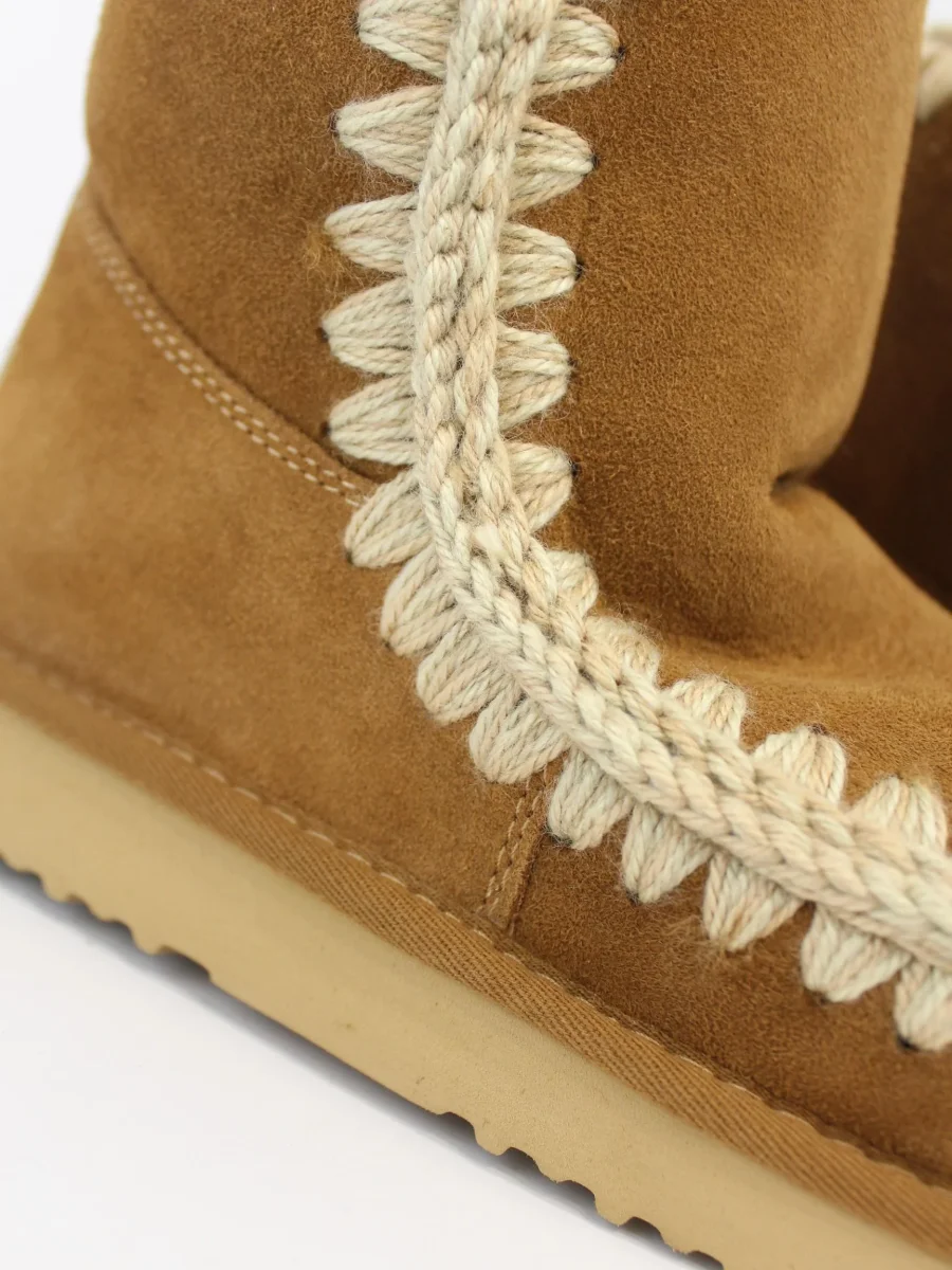 Stivaletto mini Mou eskimese, realizzato in calda pelle di pecora double face, cuciture in lana all’uncinetto, suola in EVA e gomma, colore cognac