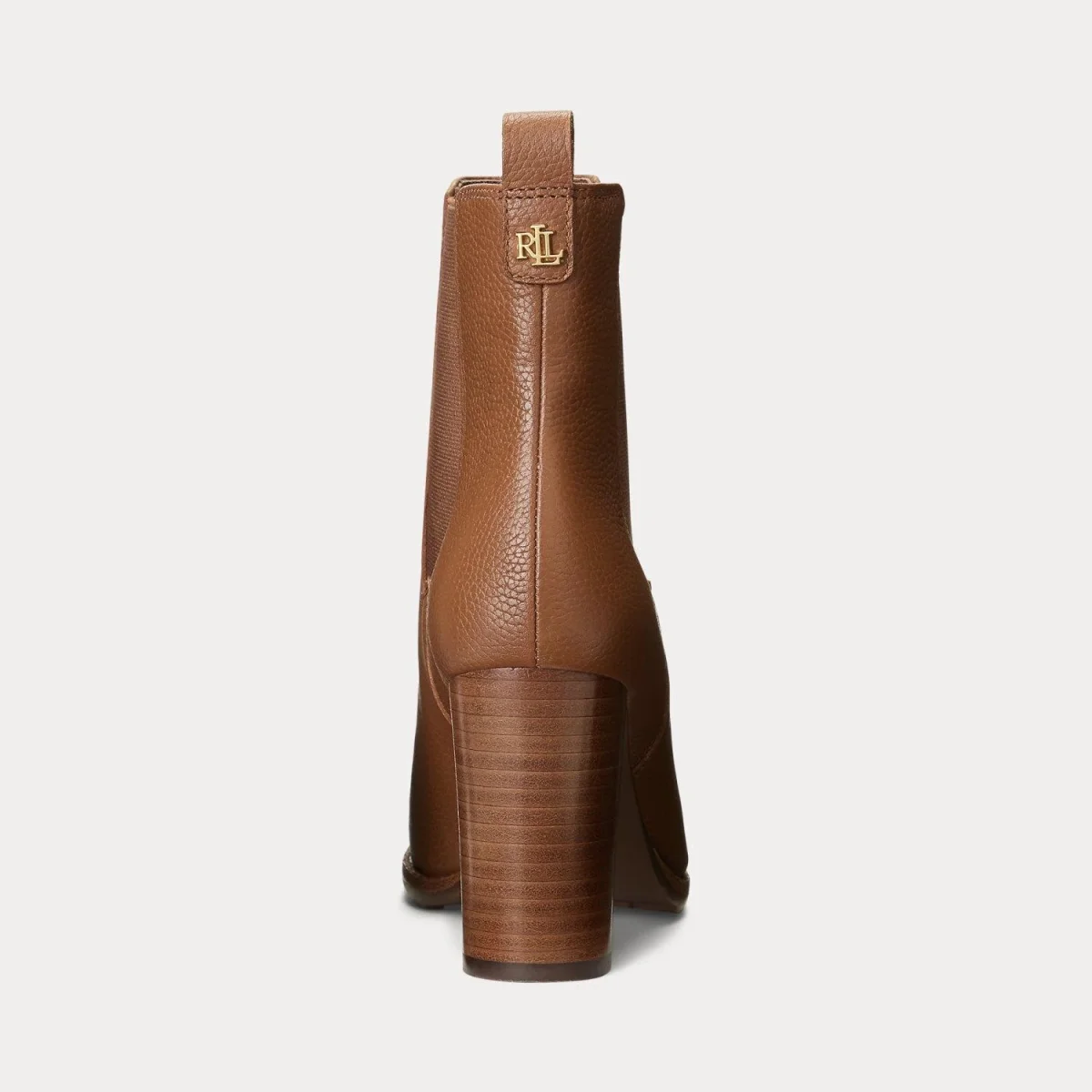 Stivaletto in pelle Ralph Lauren, tacco 8,5 cm punta a mandorla, inserti laterali elasticizzati, logo in metallo lucido sul tallone, soletta imbottita e suola in gomma, colore cuoio