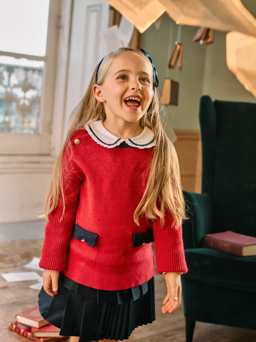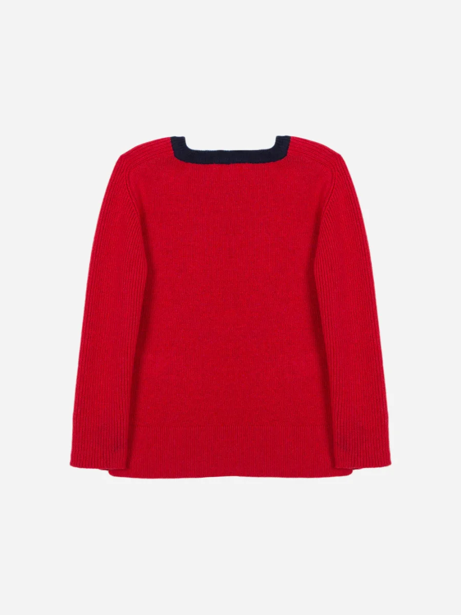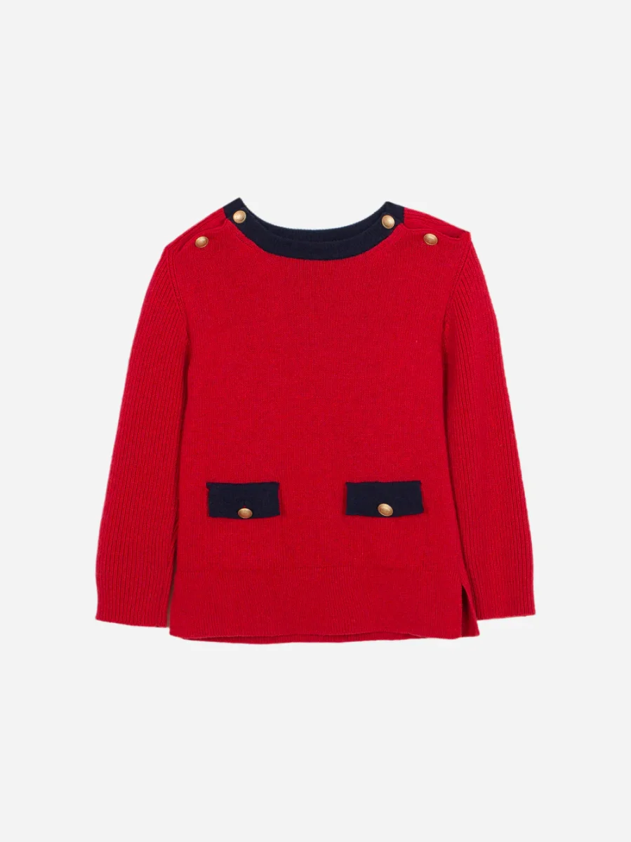 Maglione rosso a maniche lunghe, scollo rotondo blu navy a contrasto, tasche applicate con bottoni oro anche sulle spalle