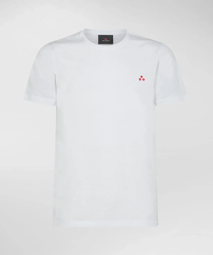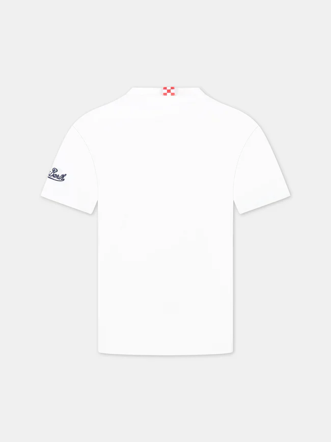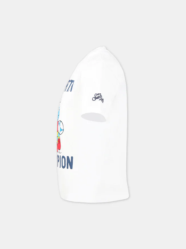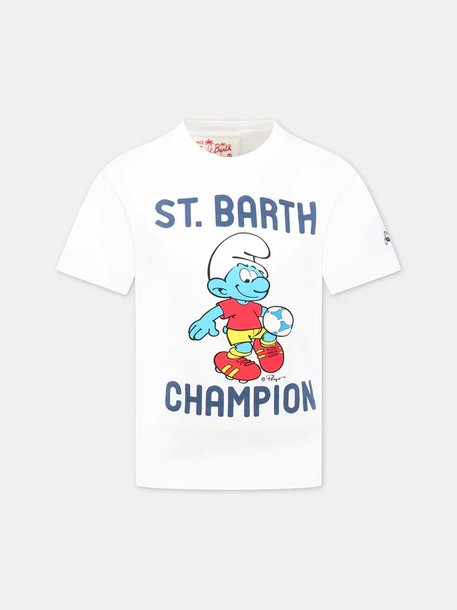 T-shirt Mc2 Saint Barth bambino, modello girocollo e maniche corte, dettaglio con stampa puffi in contrasto e scritta brand in contrasto