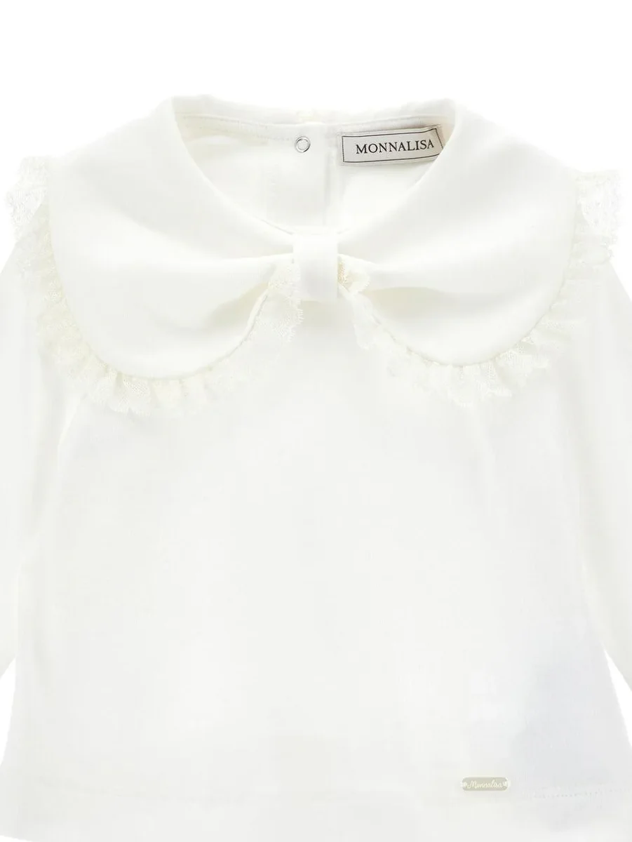 T-shirt neonata Monnalisa modello con colletto decorativo in pizzo, chiusura posteriore con bottoni, maniche lunghe, colore bianco