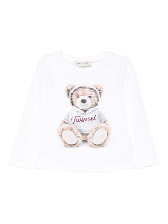 T-shirt Twinset Girl, maniche lunghe, girocollo, dettaglio logo orsetto in contrasto al centro, colore bianco