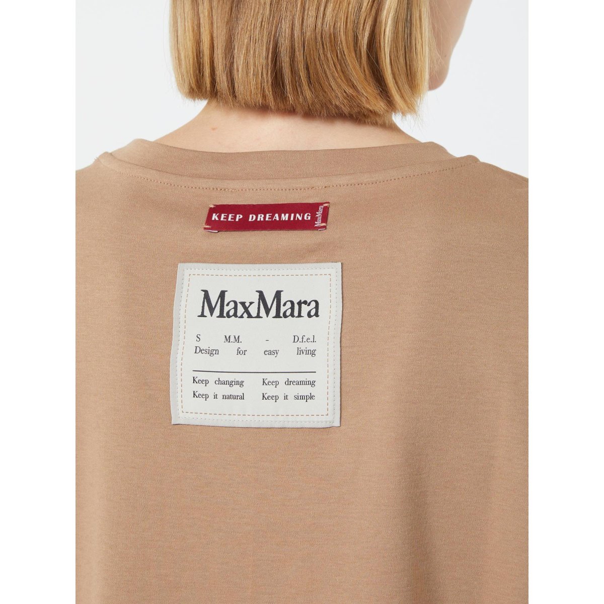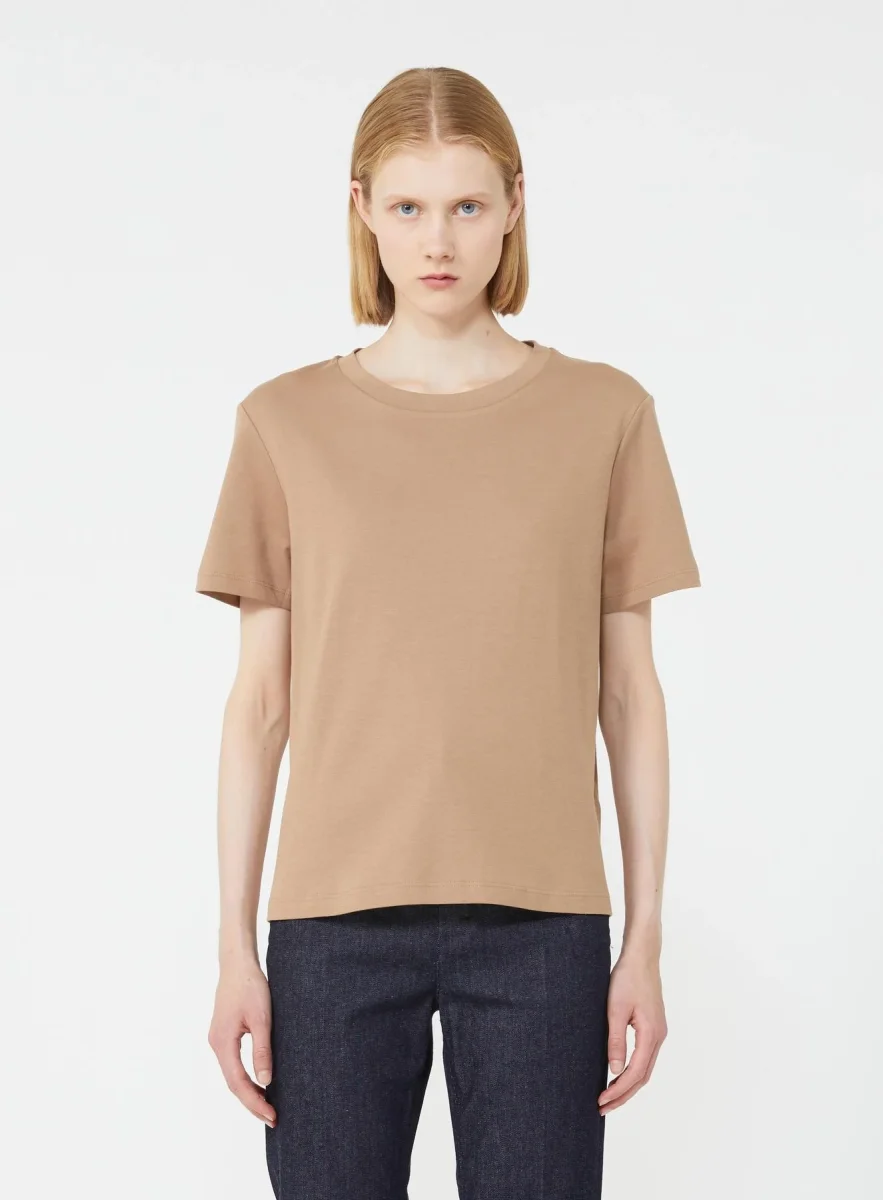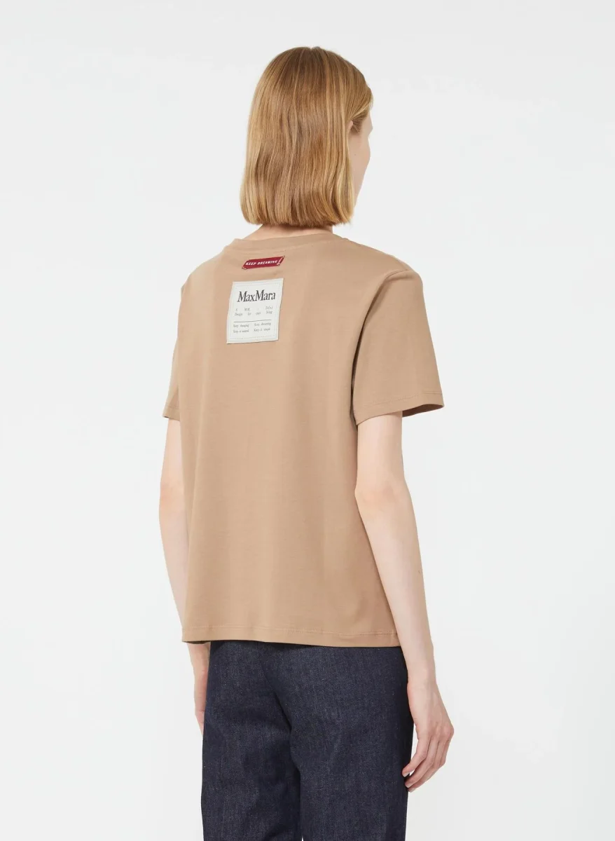 T-shirt Gemma Max Mara, modello girocollo e maniche corte, dettaglio con patch logo applicata sulla schiena in contrasto, color cammello