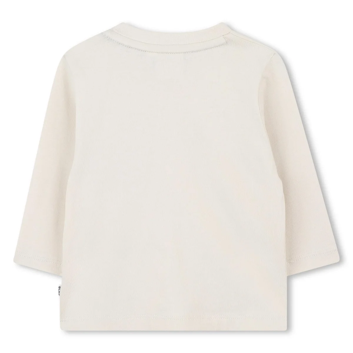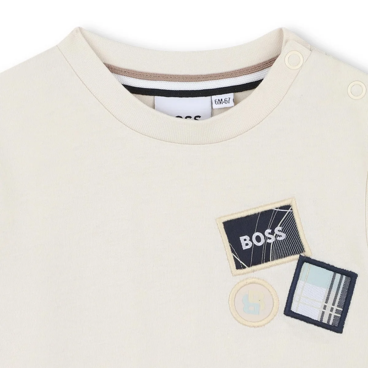 T-shirt Boss bambino, girocollo e maniche lunghe, dettaglio con bottoncini sulla spalla e patch applicate al petto
