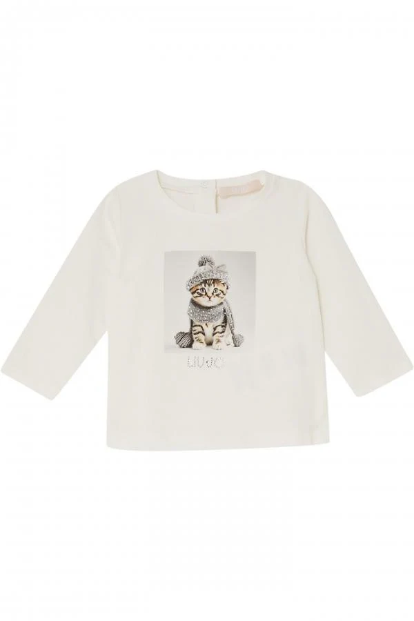 T-shirt Liu Jo Junior, modello girocollo e maniche lunghe, dettaglio con stampa in contrasto gattino, colore bianco