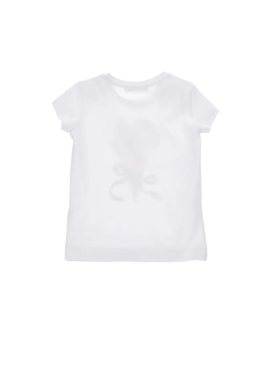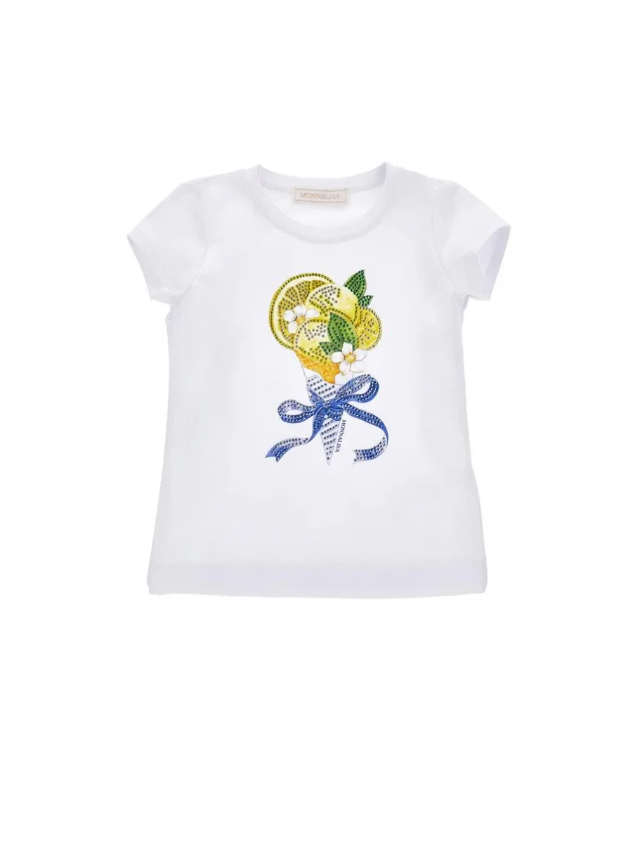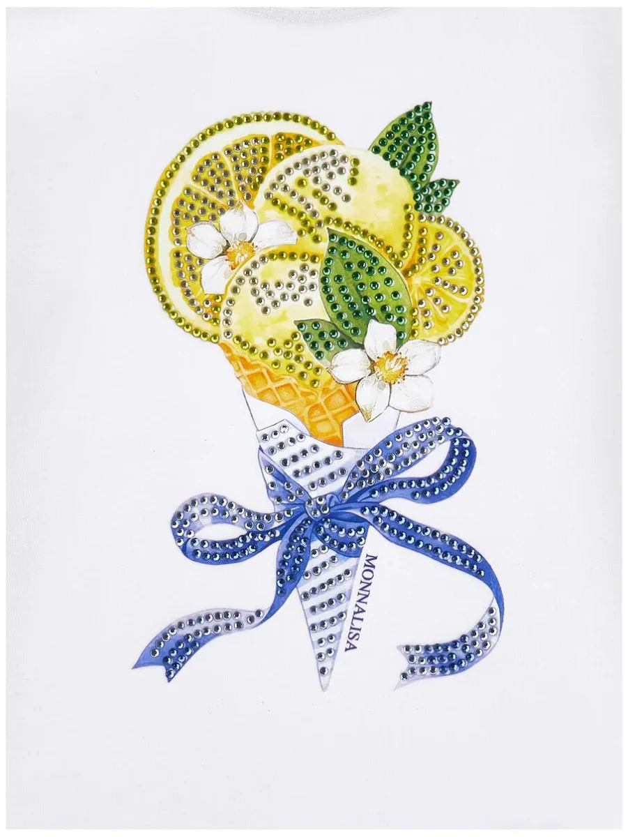 T-shirt Monnalisa, modello con stampa a cono gelato, dettagli strass in contrasto, realizzata in morbido jersey, colore bianco