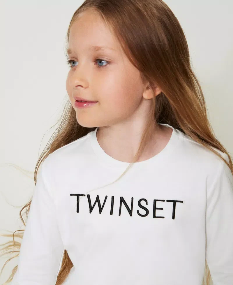 T-shirt cropped Twinset Girl, modello in jersey di cotone stretch, collo rotondo, maniche lunghe e logo lettering ricamato a filo, colore bianco