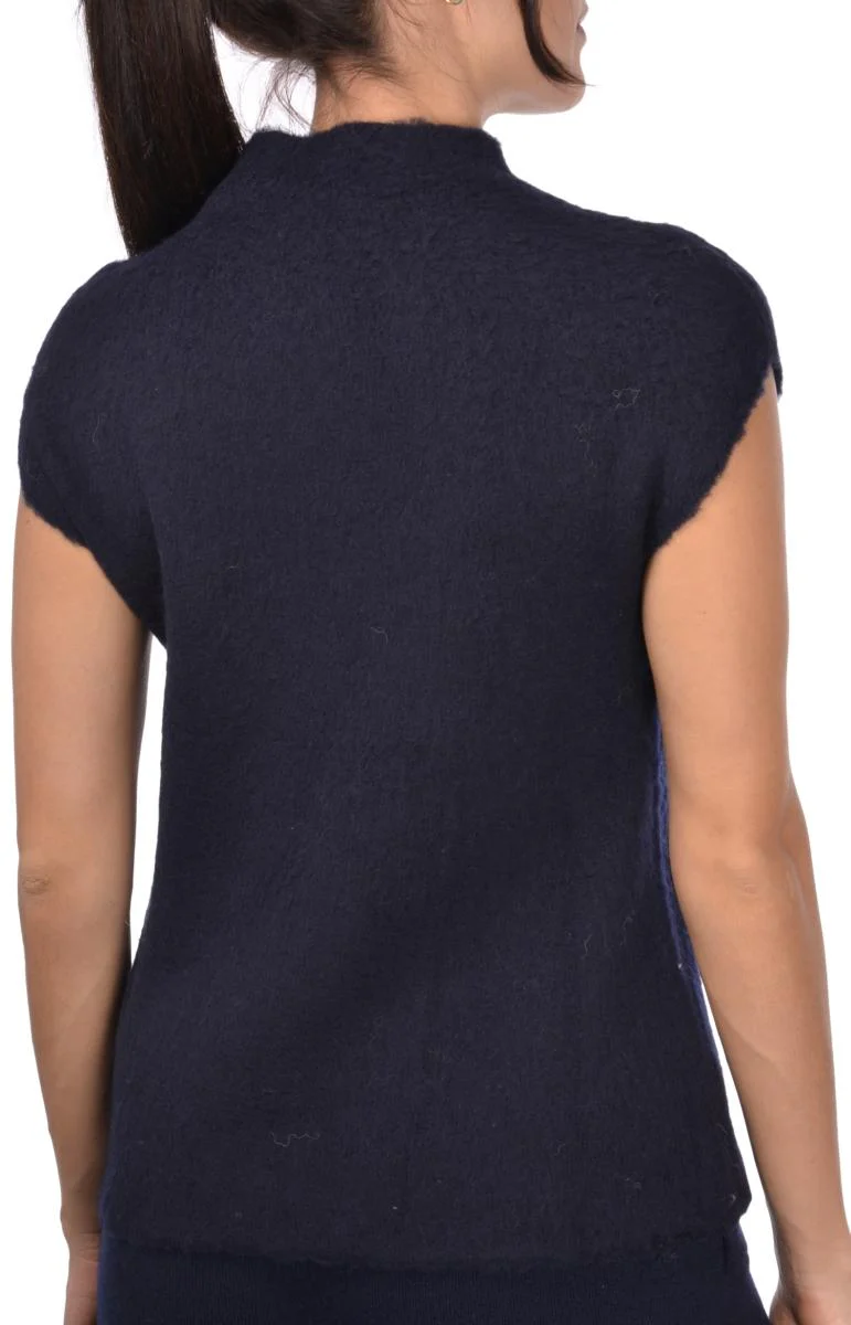 T-shirt smanicata Gran Sasso, con collo a lupetto in lana, due fili effetto bouclè impreziosito da luminosi Swarowski, colore blu